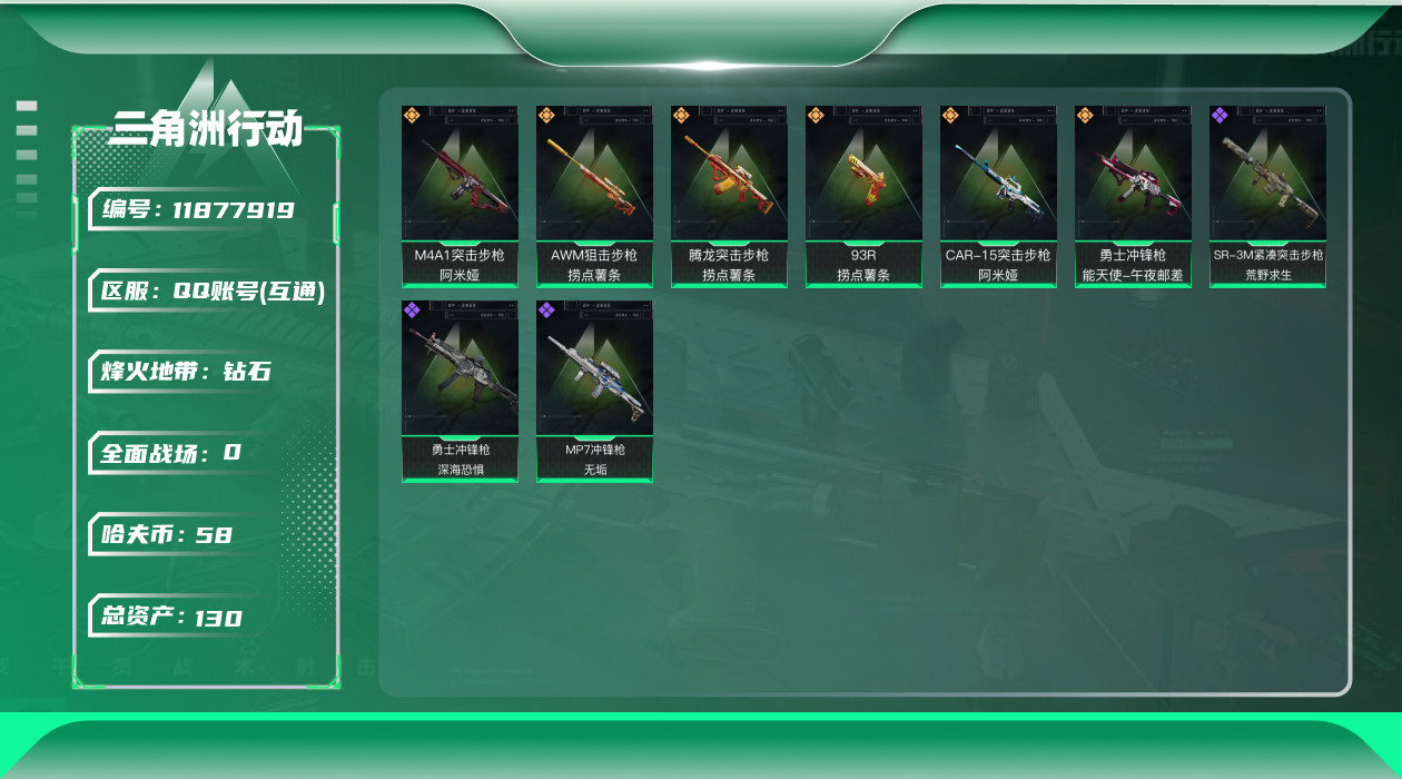 [11877919]总资产:130M 6传说枪械 哈夫币:58.033K 高级安全箱(2×3)9.15号到期 可二次 可修改实名 烽火地带段位:钻石 全面战场段位:尉官 传说武器皮肤:M4A1突击步枪-阿米娅,CAR-15突击步枪-阿米娅,AWM狙击步枪-捞点薯条,腾龙突击步枪-捞点薯条,93R-捞点薯条,勇士冲锋枪-能天使-午夜邮差 史诗武器皮肤:勇士冲锋枪-深海恐惧,SR-3M紧凑突击步枪-荒野求生,MP7冲锋枪-无垢