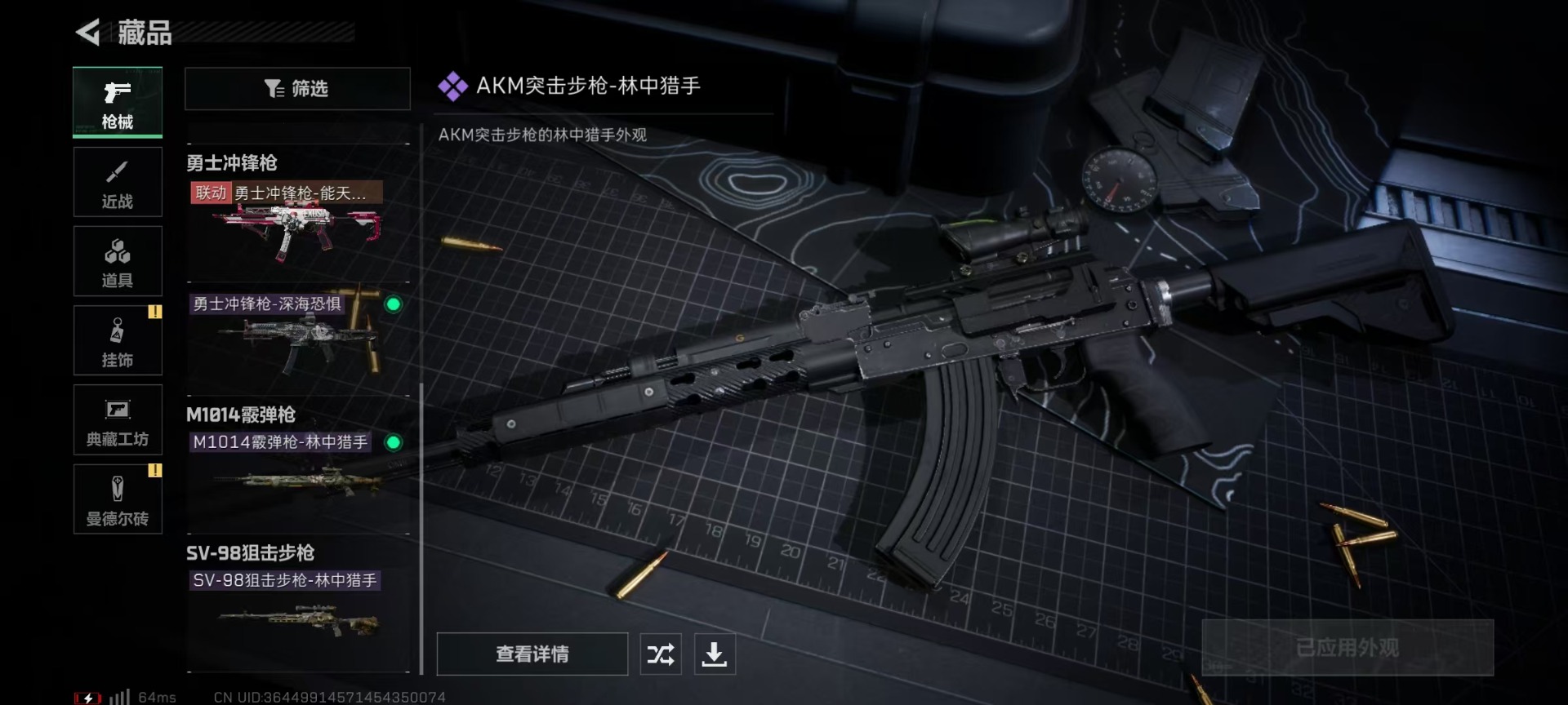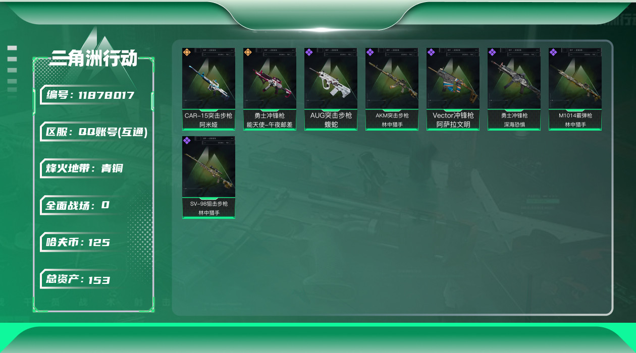 [11878017]总资产:153.7M 2传说枪械 哈夫币:125K 可二次 可修改实名 优质装备:顶级安全箱(3x3) 烽火地带段位:青铜 全面战场段位:无段位 传说武器皮肤:CAR-15突击步枪-阿米娅,勇士冲锋枪-能天使-午夜邮差 史诗武器皮肤:AUG突击步枪-蝮蛇,勇士冲锋枪-深海恐惧,AKM突击步枪-林中猎手,M1014霰弹枪-林中猎手,SV-98狙击步枪-林中猎手,Vector冲锋枪-阿萨拉文明