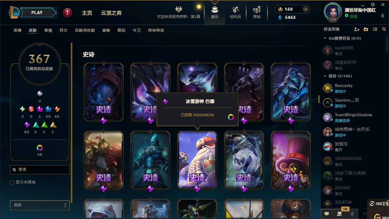 - [11818821]V8 1典藏 25传说 124英雄 244皮肤 可修改实名 优质装备:弑枪猎影(韩信典藏),云鹰飞将(小将军),一念神魔,音你心动-小乔,地狱之眼,飞鸢探春,音你心动-周瑜,李逍遥,时之恋人-刘备(电焊工),超时空战士-狄仁杰,无双飞将,碎云,澜逐花归海,琥珀纪元铠,琥珀纪元马超 传说皮:乘龙·问璇玑(孙尚香年限),乘龙·铭钟鼎(赵云年限),乘龙·淬吴钩(孙策年限),貂蝉曦玄引,吕布曦玄引,典韦战鼓燎原,落雪白狼,幻光神枪 珍宝阁皮:妄想食味 限定皮:鸣野蒿,白晶晶,诗剑行,五谷丰年,烈魂,李小龙,孙行者 史诗皮:鸭鸭历险记-刘禅,器灵·浮梦炉,化蝶舞,龙之律动,石田雨龙,蒙犽顽岩魄,蔬乡物语(鲁班七号),超元猎域,乘龙·聚宝船(安琪拉年限),乘龙·忆丹青(大乔年限),琥珀纪元伽罗,百相守梦-黄忠,紫霞仙子,苍穹之光,白龙吟,千年之狐,永昼,真我赫兹(百里守约),江河有灵,高渐离燃音魔法,暗夜猫娘,魅语,无限星赏官,晚萤,末日机甲-吕布,猫狗日记-大乔,乱世虎臣,节奏热浪,修罗,女仆咖啡,摇滚巨星,水果甜心,绅士熊喵,天才门将,星夜王子,心灵骇客,功夫厨神,德古拉伯爵,暗隐猎兽者,幽灵船长,鬼剑武藏,暗渊魔法,心灵战警,天秀·启明,舞动绿茵,地狱岩魂,纤云弄巧,拒霜思,缤纷独角兽,乘风破浪,水晶猎龙者,曙光守护者,箭羽风息,唤灵魅影,金属风暴,圣诞狂欢,圣诞恋歌,鹰眼统帅,魅力维加斯,未来纪元-赵云