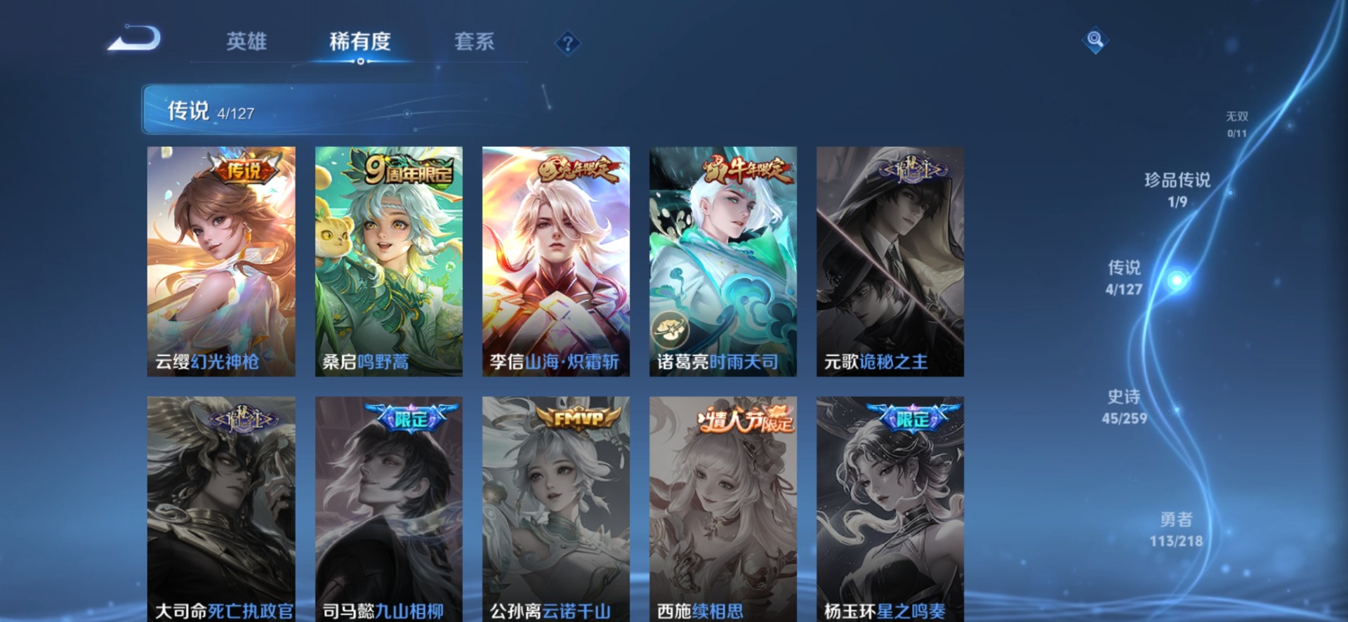 - PX_2084328-贵族等级: V5 英雄数: 111 皮肤数: 117 传说皮: 澜逐花归海 限定皮: 梁祝,五谷丰年