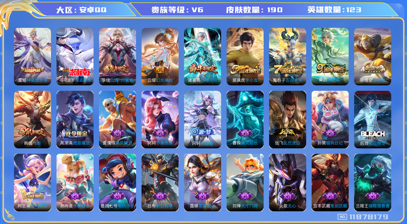 - [11227588]V8 2典藏 8传说 119英雄 215皮肤 可修改实名 荣耀水晶:银白咏叹调(倪克斯侍卫),杀手不太冷 传说皮:黄金狮子座,猫影幻舞,炽阳神光,无双飞将,超时空战士-狄仁杰,山海·苍雷引(电光曜子) 珍宝阁皮:玩趣恶龙 限定皮:鸣野蒿,神威(电光马子),飞衡(韩信年限),五谷丰年,冰锋战神,梁祝,逐梦之影,霸王别姬-虞姬,奇迹圣诞,神奇女侠,山海·玄木吟(马可年限) 史诗皮:紫霞仙子,苍穹之光,电玩小子(小书包),黄金分割率,特工魅影,永昼,蒙恬荣光圣徽,冰冠公主,偶像歌手,晚萤,无限星赏官,龙骑士(小龙虾),末日机甲-吕布,猫狗日记-孙策,乱世虎臣,节奏热浪,修罗,女仆咖啡,水果甜心,天才门将,星夜王子,心灵骇客,功夫厨神,德古拉伯爵,暗隐猎兽者,幽灵船长,鬼剑武藏,地狱岩魂,纤云弄巧,繁星吟游(呼啦呼啦),缤纷独角兽,乘风破浪,逐浪之夏,水晶猎龙者,热力回旋,金属风暴,原初追逐者,圣诞狂欢,鹰眼统帅,王者之锤,魅力维加斯,黎明之约,赏金猎手