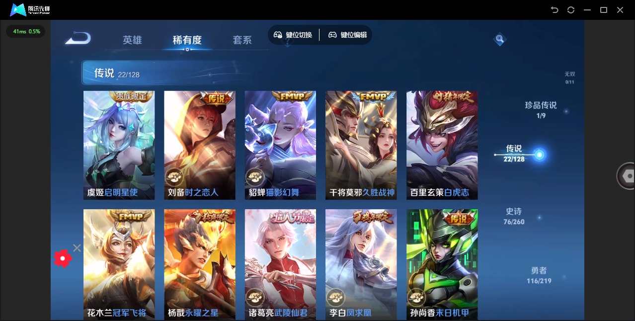 - PX_2080818-84 安卓QQ/最强王者/269皮肤/125英雄/3典藏/0珍品无双/0无双/1珍品传说/25传说/91史诗/9稀有英雄 【1 珍品传说】大耳狗之梦 瑶, 【3 典藏皮肤】鸣剑·曳影 李白,全息碎影 孙悟空,九霄神辉 花木兰, 【25 传说皮肤】胖达荣荣 梦奇,启明星使 虞姬,云霓雀翎 虞姬,时之祈愿 瑶,云鹰飞将 曜,补天 女娲,仲夏夜之梦 貂蝉,炽阳神光 镜,寅虎·瑞焰