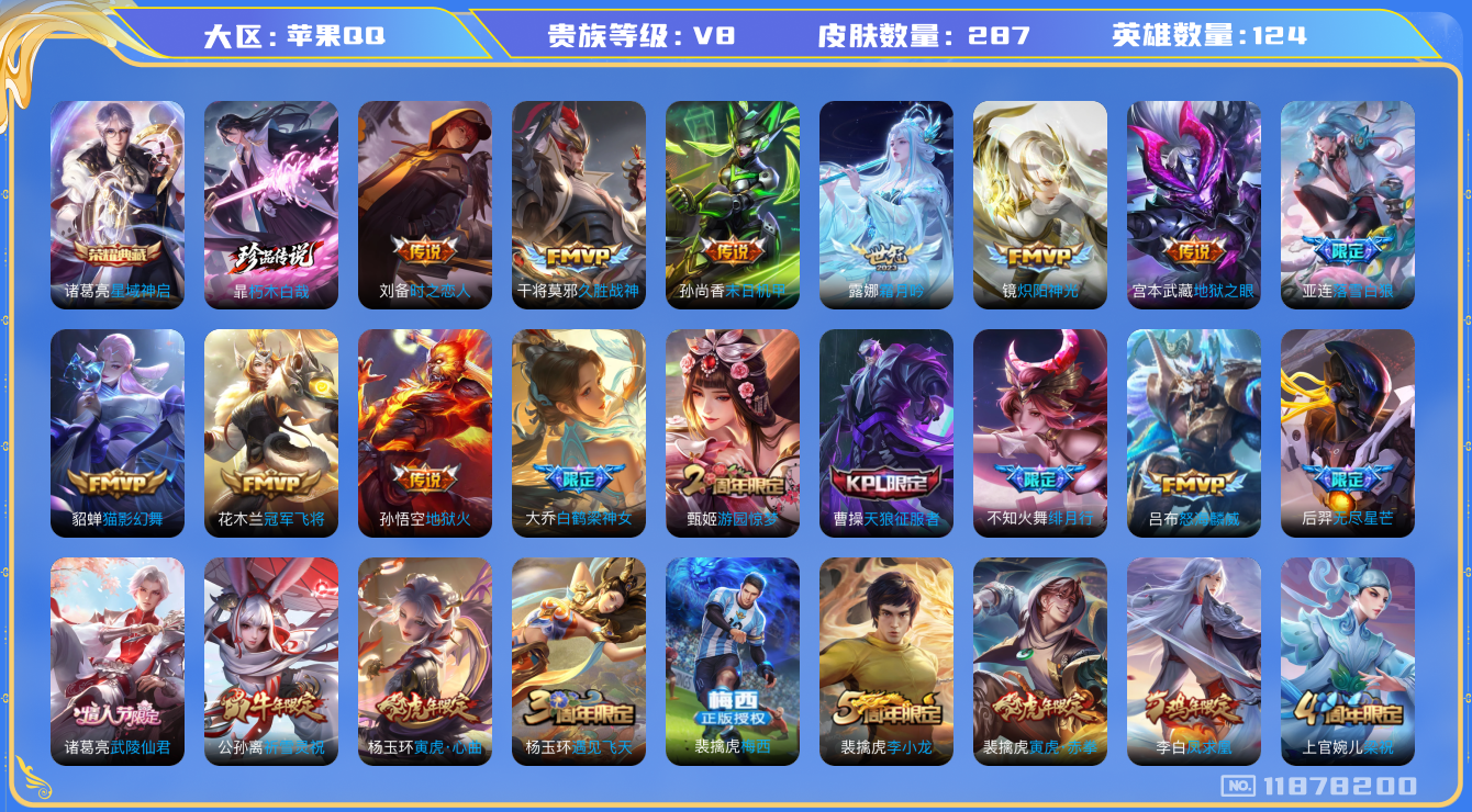 [11878200]V8 1典藏 1珍品传说 22传说 124英雄 287皮肤 可修改实名 优质装备:星域神启(倪克斯贼亮),朽木白哉,冠军飞将,猫影幻舞,久胜战神,炽阳神光,末日机甲-孙尚香(绿蚂蚱),地狱火,地狱之眼,时之恋人-刘备(电焊工),霜月吟,涂山容容 传说皮:落雪白狼 珍宝阁皮:万物之道,优雅恋人 限定皮:愿照·九州拓(澜年限),鸣野蒿,至尊宝,白虎志(电光耗子),凤求凰(白切鸡),梅西,武陵仙君(小桃花),傲雪梅枪,绯月行,白鹤梁神女,神威(电光马子),遇见飞天,怒海麟威,五谷丰年,冰锋战神,游园惊梦,梁祝,天狼征服者,祈雪灵祝(雪兔子),李小龙,逐梦之影,朱雀志(守约年限),永曜之星,大圣娶亲,青春决赛季,美猴王,寅虎·心曲(虎婆),寅虎·赤拳(老虎年限),无尽星芒,山海·玄木吟(马可年限) 史诗皮:器灵·浮梦炉,化蝶舞,龙之律动,百相守梦-周瑜,百相守梦-黄忠,紫霞仙子,白龙吟,黄金分割率,特工魅影,千年之狐,魅语,蒙恬荣光圣徽,无限星赏官,冰冠公主,龙骑士(小龙虾),猫狗日记-孙策,乱世虎臣,节奏热浪,修罗,水果甜心,星夜王子,功夫厨神,德古拉伯爵,暗隐猎兽者,幽灵船长,鬼剑武藏,心灵战警,繁星吟游(呼啦呼啦),拒霜思,乘风破浪,逐浪之夏,月团寄思,水晶猎龙者,曙光守护者,金属风暴,原初追逐者,圣诞狂欢,圣诞恋歌,鹰眼统帅,暗夜贵公子,魅力维加斯,黎明之约,赏金猎手,未来纪元-赵云