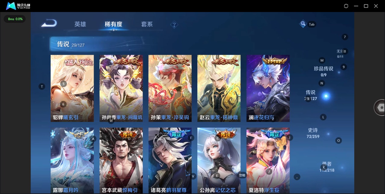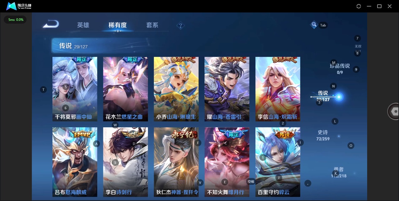 - PX_2084328-贵族等级: V5 英雄数: 111 皮肤数: 117 传说皮: 澜逐花归海 限定皮: 梁祝,五谷丰年