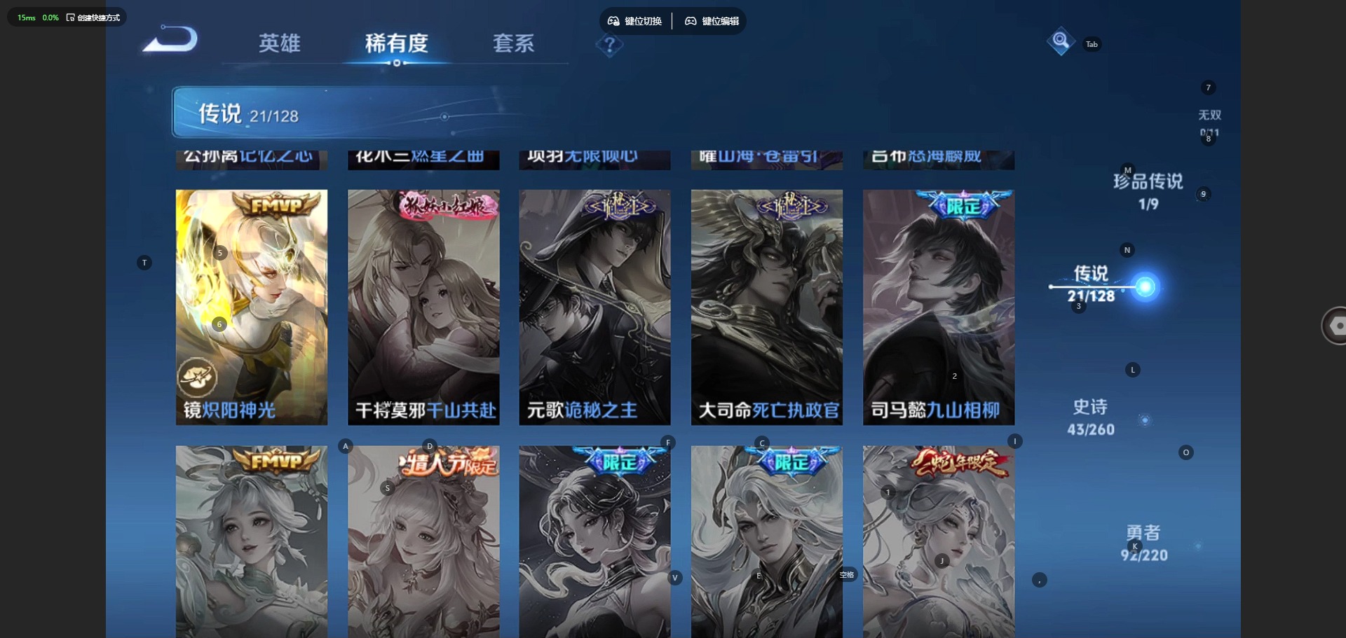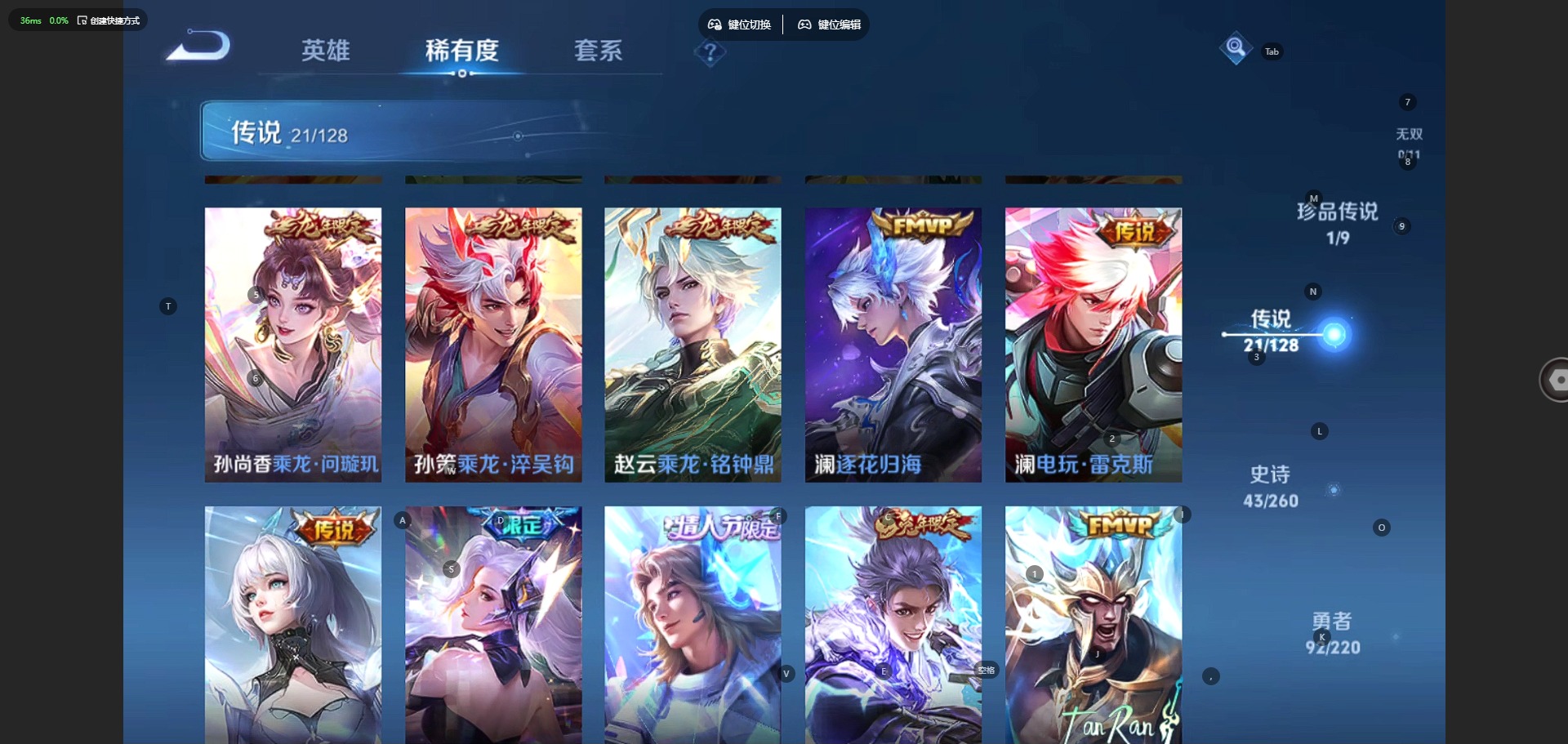 - [11880755]V7 4传说 124英雄 250皮肤 可修改实名 优质装备:末日机甲-孙尚香(绿蚂蚱),零号·赤焰,淬星耀世 珍宝阁皮:妄想食味,蔷薇恋人 限定皮:鸣野蒿,遇见飞天,高山流水,五谷丰年,青龙志(铠年限),游园惊梦,梁祝,龙胆,李小龙,孙行者,大圣娶亲 史诗皮:星界战将,蒙犽顽岩魄,百相守梦-黄忠,特工魅影,千年之狐,蒙恬荣光圣徽,冰冠公主,暗夜猫娘,末日机甲-吕布,时之恋人-孙尚香,节奏热浪,摇滚巨星,水果甜心,心灵骇客,功夫厨神,暗隐猎兽者,鬼剑武藏,地狱岩魂,繁星吟游(呼啦呼啦),乘风破浪,逐浪之夏,曙光守护者,金属风暴,原初追逐者,圣诞狂欢,圣诞恋歌,鹰眼统帅,魅力维加斯,黎明之约,无心,未来纪元-赵云