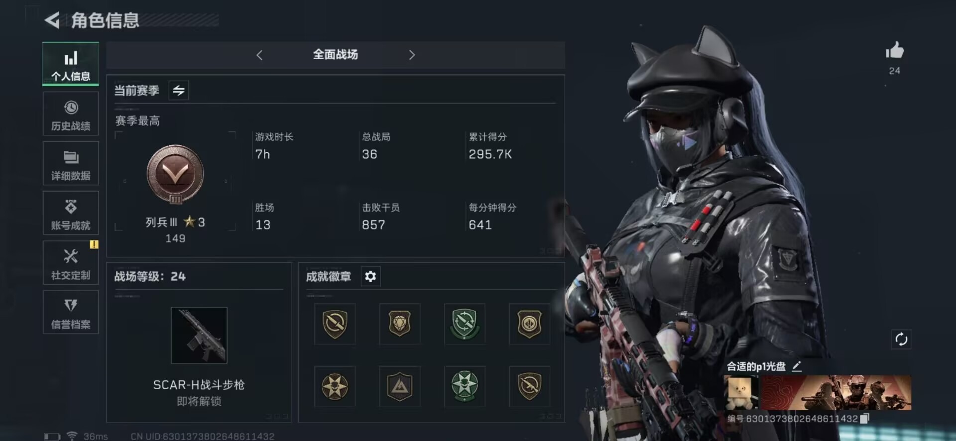 - [11296492]总资产:329.8 2传说枪械 进阶安全箱(9.17到期) 可二次 可修改实名 烽火地带段位:黑鹰 全面战场段位:无段位 哈夫币:282 传说武器皮肤:复合弓-黑-天际线,CAR-15突击步枪-阿米娅 史诗武器皮肤:AUG突击步枪-蝮蛇,M16A4突击步枪-竞赛选手,SV-98狙击步枪-林中猎手