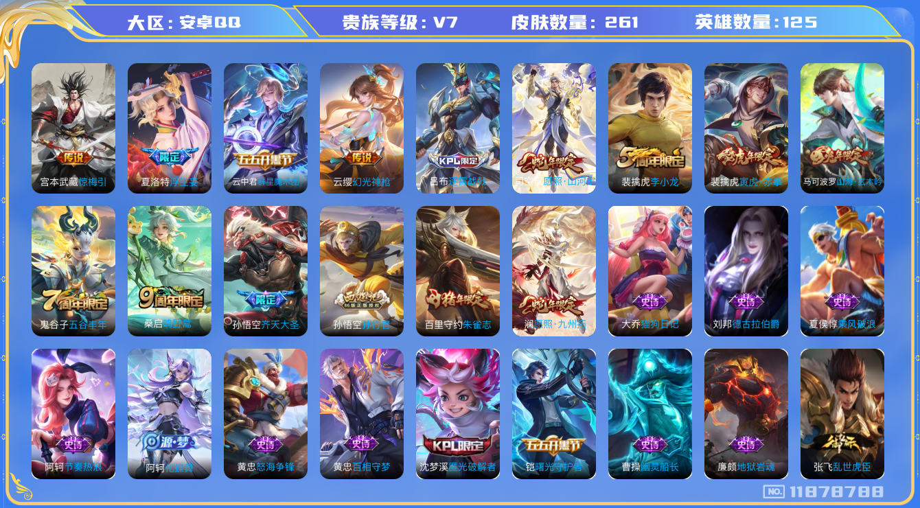 [11878788]V7 9传说 125英雄 261皮肤 可修改实名 优质装备:浮生妄,惊梅引,云中君群星魔术团 传说皮:幻光神枪 珍宝阁皮:妄想食味,优雅恋人,女武神 限定皮:愿照·九州拓(澜年限),愿照·山河定(司空震年限),逐霄战戟,鸣野蒿,齐天大圣,五谷丰年,李小龙,朱雀志(守约年限),孙行者,寅虎·赤拳(老虎年限),山海·玄木吟(马可年限) 史诗皮:器灵·浮梦炉,化蝶舞,星界战将,龙之律动,石田雨龙,怒海争锋,破空之剑,上官婉儿群星魔术团,蔬乡物语(鲁班七号),百相守梦-百里守约,百相守梦-黄忠,紫霞仙子,特工魅影,千年之狐,永昼,江河有灵,鹤归松栖(赵怀真),百解令(蒙犽),蒙恬荣光圣徽,匿光破解者,偶像歌手,龙骑士(小龙虾),末日机甲-吕布,猫狗日记-孙策,猫狗日记-大乔,乱世虎臣,节奏热浪,女仆咖啡,摇滚巨星,水果甜心,绅士熊喵,天才门将,星夜王子,功夫厨神,德古拉伯爵,暗隐猎兽者,幽灵船长,鬼剑武藏,心灵战警,地狱岩魂,纤云弄巧,乘风破浪,逐浪之夏,水晶猎龙者,曙光守护者,金属风暴,原初追逐者,圣诞狂欢,圣诞恋歌,鹰眼统帅,暗夜贵公子,魅力维加斯,黎明之约,无心,未来纪元-赵云