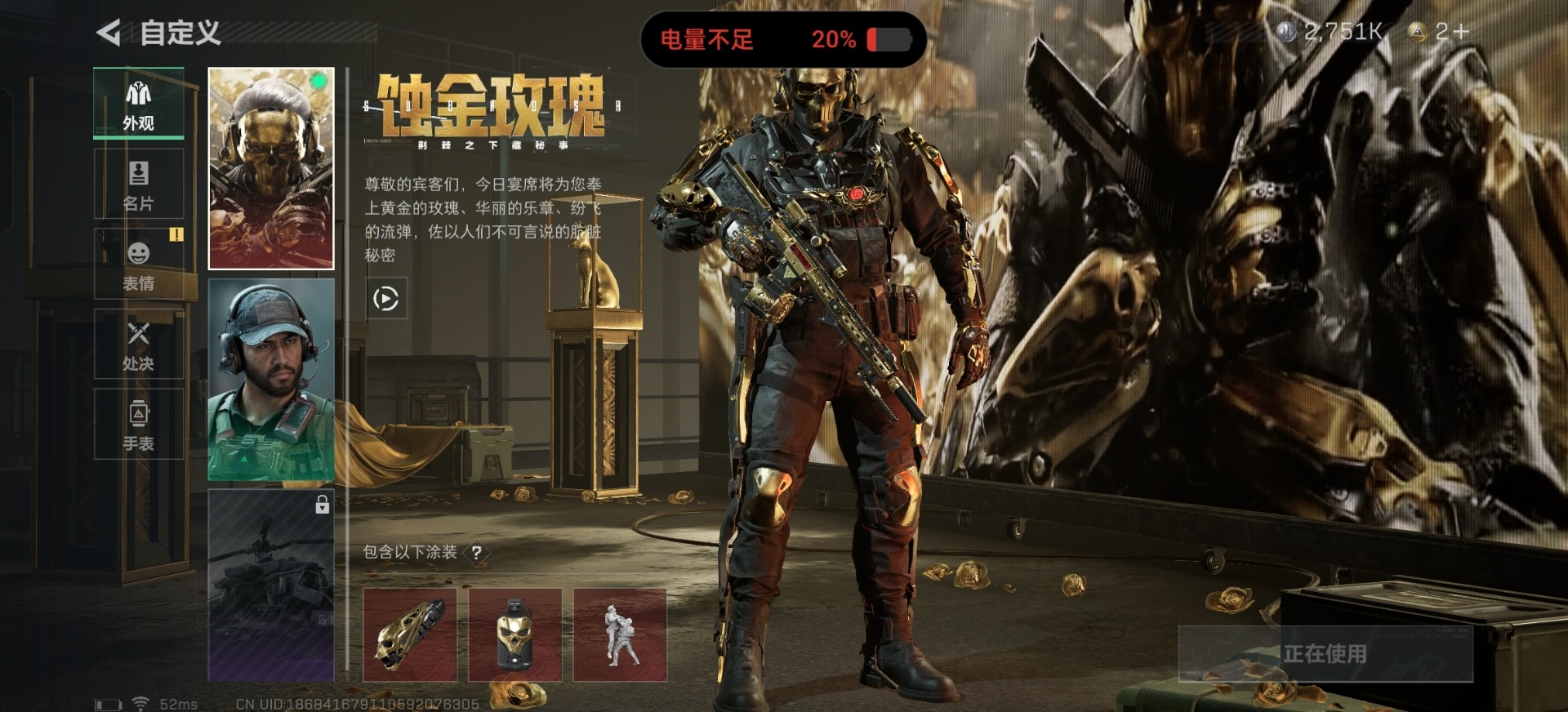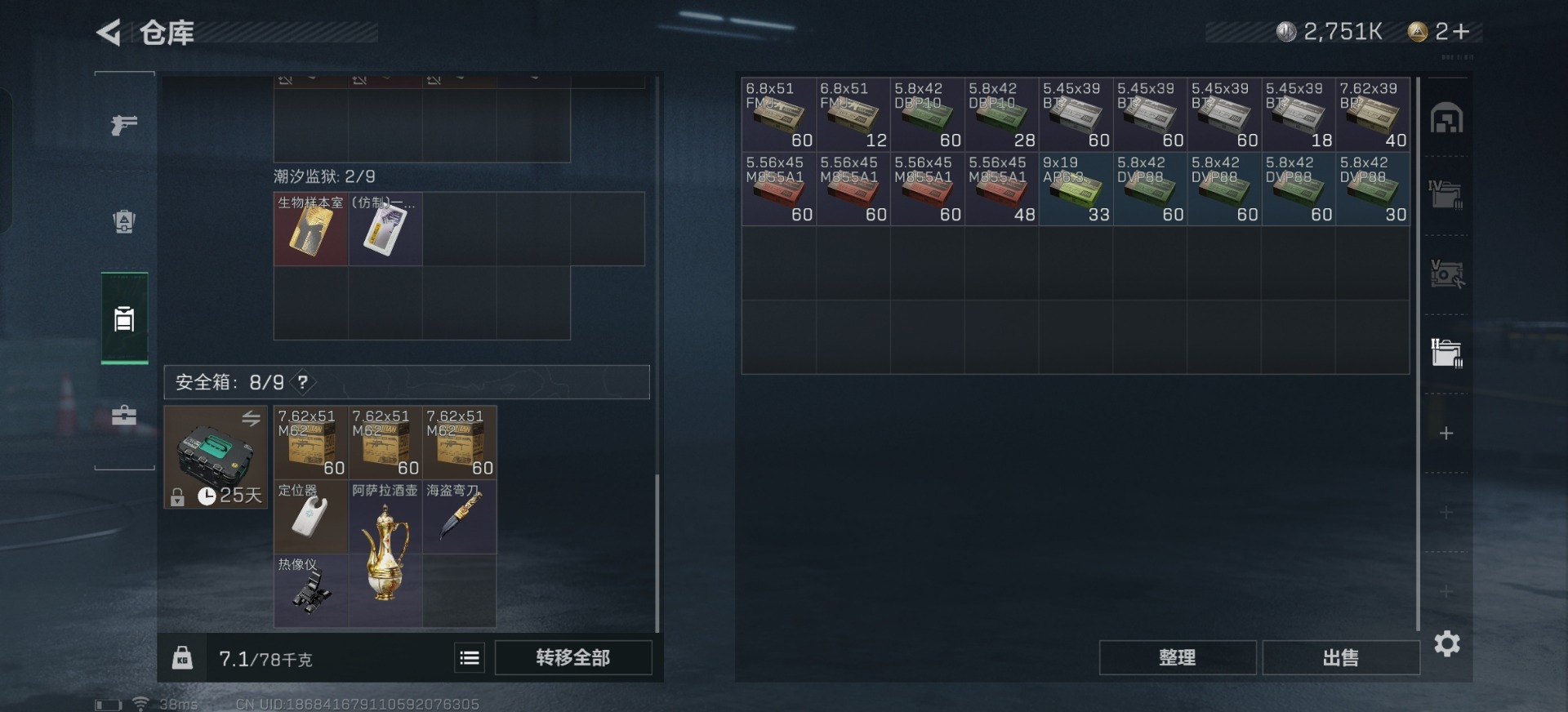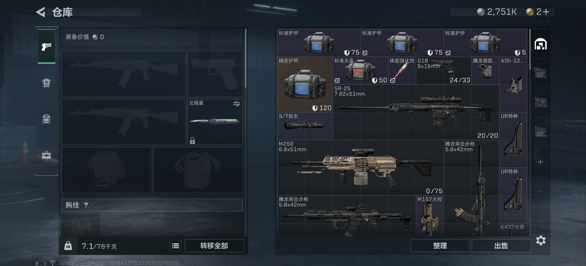 - [12025662]总资产:139M 7传说枪械 哈夫币:94.677K 进阶安全箱(9.17到期) 可二次 可修改实名 烽火地带段位:钻石 全面战场段位:无段位 传说武器皮肤:SMG45冲锋枪-骑士,CAR-15突击步枪-阿米娅,AK-12突击步枪-特斯拉线圈,SR-3M紧凑突击步枪-特斯拉线圈,UZI冲锋枪-特斯拉线圈,勇士冲锋枪-能天使-午夜邮差,Vector冲锋枪-能天使-午夜邮差 史诗武器皮肤:MP5冲锋枪-深海恐惧,SG552突击步枪-深海恐惧,AKM突击步枪-林中猎手,M16A4突击步枪-竞赛选手,M1014霰弹枪-林中猎手,M250通用机枪-囚徒,SV-98狙击步枪-囚徒,SCAR-H战斗步枪-囚徒,沙漠之鹰-曙光