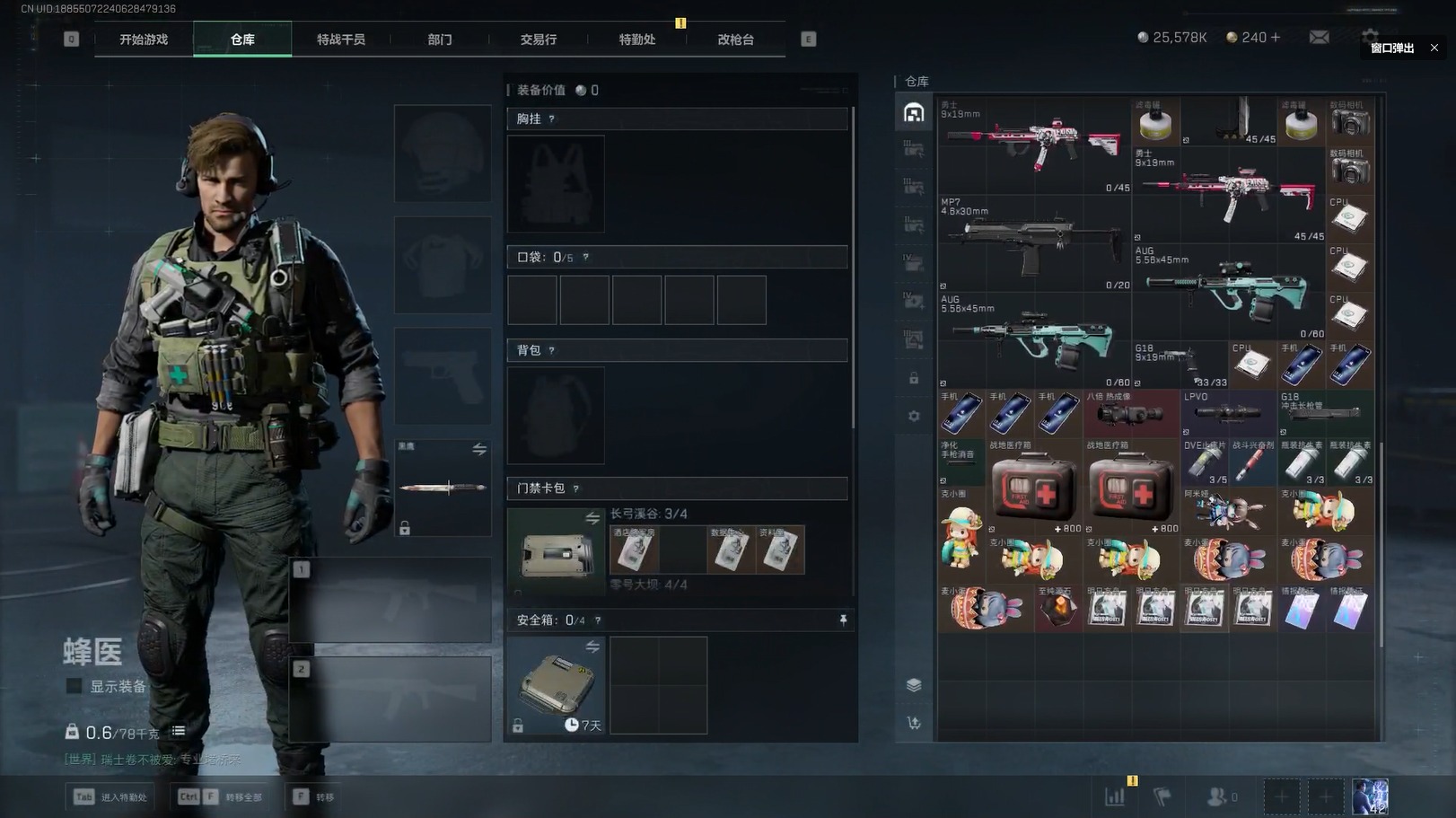 - [5966416]实名: 可修改 时装数: 75 载具数: 1 枪械数: 34 战备数: 37 神级装扮: 墨龙九天-敖渊 热门装扮: 时空协奏·心弦,女娲灵识 载具: 护世瑞兽 稀有枪皮: P90沙丘之主,M24镜域双华,Kar98K-巳巳如意,SCAR-L金蛇镇世