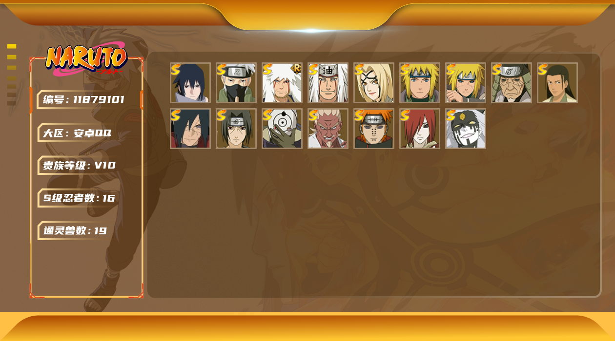 - [11875662]V10 20S忍 27A忍 17通灵 783.2W战力 可二次 可修改实名 优质装备:宇智波鼬「秽土转生」,宇智波斑「秽土转生」,宇智波斑 「木叶创立」,千手扉间「秽土转生」,纲手「百豪」,千手柱间,迈特凯「死门」,宇智波带土 「忍界大战」,“宇智波斑” 「白面具」,漩涡鸣人 「九喇嘛连结」,春野樱 「忍界大战」,神秘面具男 「红夜之刃」,宇智波佐助「永恒万花筒」,宇智波斑「秽土转生·解」,艾「忍界大战」 S级忍者:自来也 「舞之豪杰」,佩恩「天道」,波风水门,大蛇丸,自来也