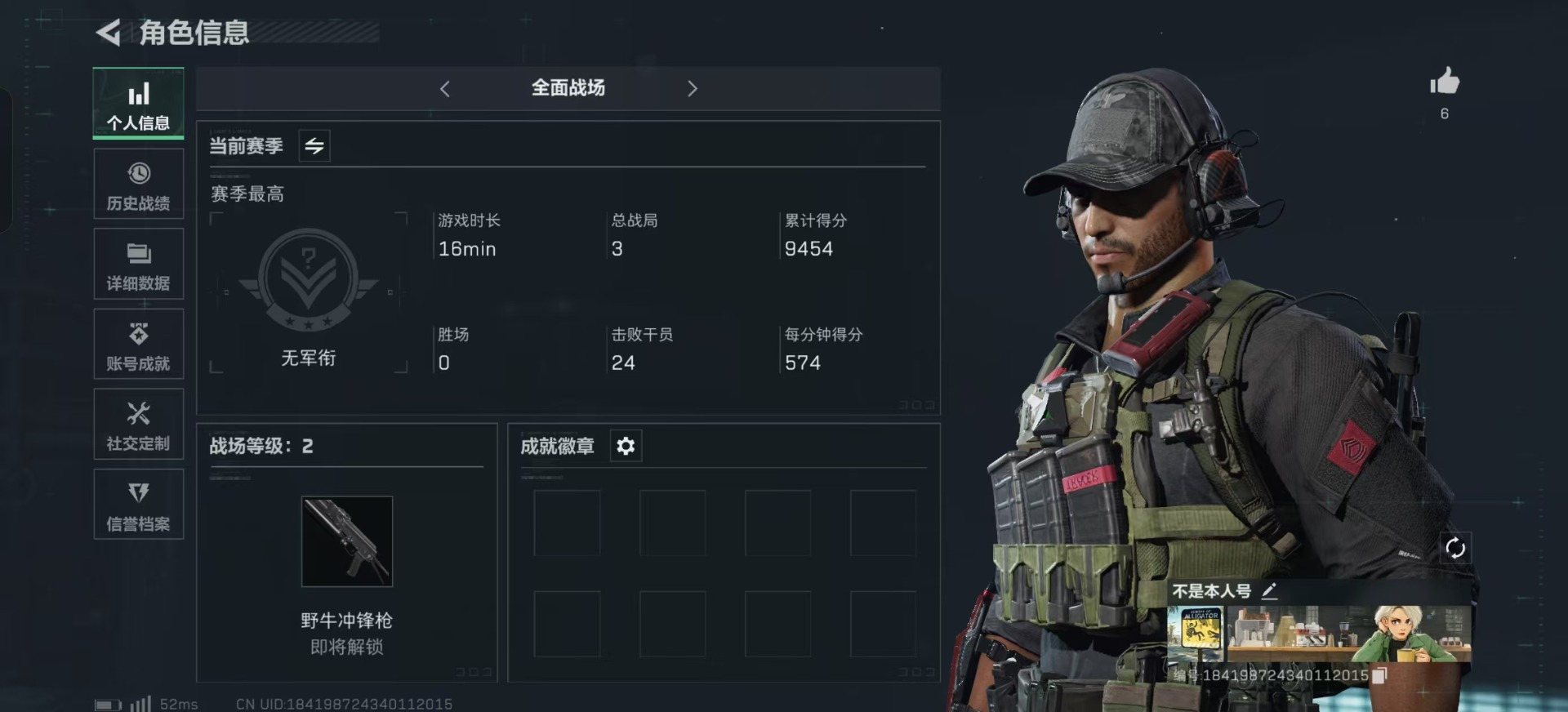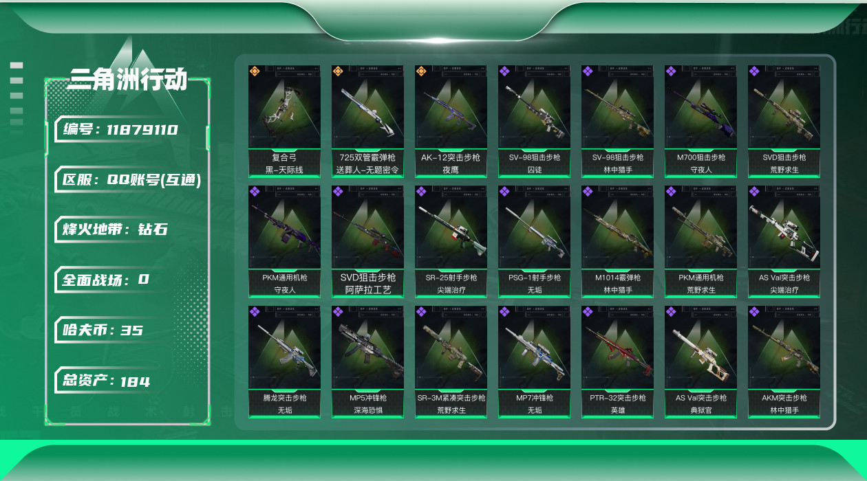 [11879110]总资产:184.8 2干员外观 3传说枪械 顶级安全箱(3×3)9.15号到期 可二次 可修改实名 烽火地带段位:钻石 全面战场段位:无段位 哈夫币:35.206 传说武器皮肤:AK-12突击步枪-夜鹰,复合弓-黑-天际线,725双管霰弹枪-送葬人-无题密令 史诗武器皮肤:SR-25射手步枪-尖端治疗,PKM通用机枪-荒野求生,AS Val突击步枪-尖端治疗,M700狙击步枪-守夜人,SG552突击步枪-尖端治疗,Ash-12战斗步枪-守夜人,MP5冲锋枪-深海恐惧,SR-3M紧凑突击步枪-荒野求生,AKM突击步枪-林中猎手,M16A4突击步枪-竞赛选手,PKM通用机枪-守夜人,SVD狙击步枪-荒野求生,M1014霰弹枪-林中猎手,SV-98狙击步枪-林中猎手,PTR-32突击步枪-英雄,PSG-1射手步枪-无垢,AS Val突击步枪-典狱官,SV-98狙击步枪-囚徒,腾龙突击步枪-无垢,MP7冲锋枪-无垢,SVD狙击步枪-阿萨拉工艺 干员外观:无名-夜鹰,蜂医-送葬人·无题密令(S5)