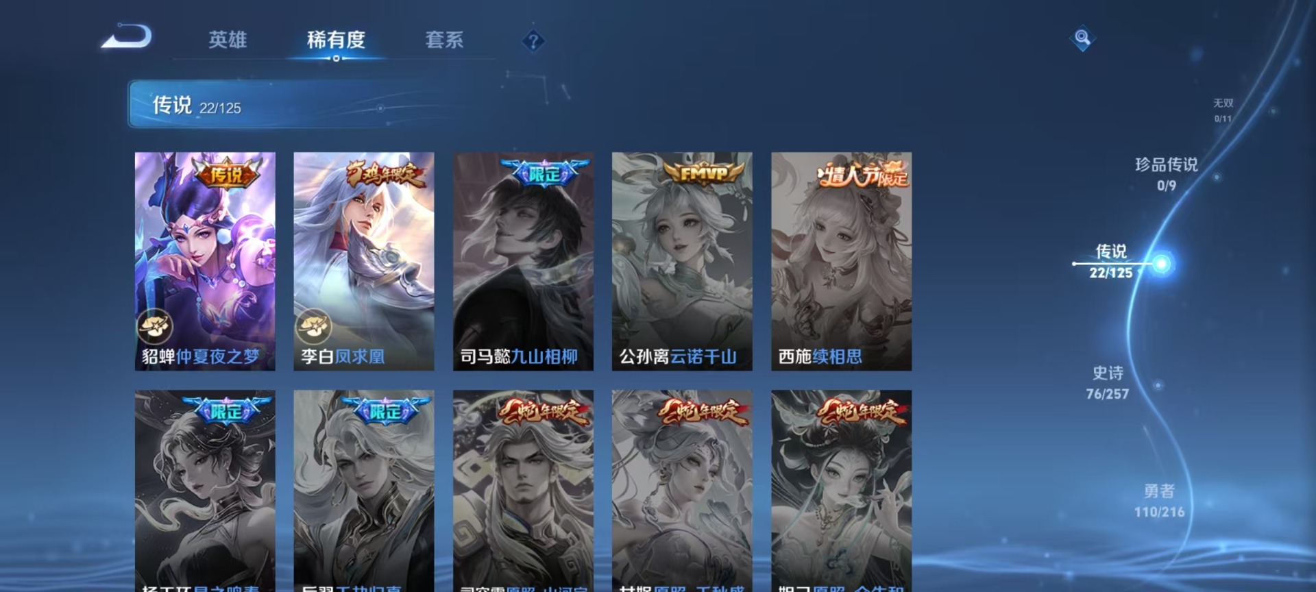 - [12087638]V10 1典藏 2无双 3珍品传说 22传说 125英雄 401皮肤 典藏英雄武则天 女号 可修改实名 优质装备:幻阙歌(貂蝉典藏),真我赫兹(瑶)(瑶无双),小乔时之魔女(小乔无双),器灵·落星盏,酷洛米之心,大耳狗之梦,冠军飞将,一念神魔,末日机甲-孙尚香(绿蚂蚱),地狱火,仲夏夜之梦(大飞蛾),零号·赤焰,海洋之心,游龙清影(小青龙),超时空战士-狄仁杰,挚爱之约,音你闪耀(rap皮),艾琳觅芳踪,涂山容容 传说皮:云诺千山,续相思,星之鸣奏 珍宝阁皮:优雅恋人,蔷薇恋人 限定皮:愿照·福禄聚(蔡文姬年限),愿照·岁时盈(虞姬年限),愿照·众生和(妲己年限),愿照·千秋盛(女娲年限),鸣野蒿,至尊宝,凤凰于飞,梅西,神威(电光马子),至美·乘鲤谣,遇见飞天,高山流水,五谷丰年,青龙志(铠年限),冰锋战神,天狼运算者,游园惊梦,梁祝,御风骁将(吕布年限),天狼狩猎者,逐梦之星,逐梦之音,天狼绘梦者,李小龙,逐梦之影,逐梦之光,玄武志(苏烈年限),朱雀志(守约年限),如梦令-嫦娥,如梦令-后羿,霸王别姬-项羽,圣诞老人,奇迹圣诞,默契交锋-兰陵王,孙行者,猪悟能,一生所爱,大圣娶亲,引擎之心,冰霜恋舞曲,云端筑梦师,热情桑巴,神奇女侠,美猴王,时之祈愿-云中君 史诗皮:赞萌露比,器灵·浮梦炉,绮世丹青,化蝶舞,灵蛊蚀心,龙之律动,茶境仙,幻珠鲛人,曹操夜都魔契,百相守梦-黄忠,遇见神鹿,紫霞仙子,电玩小子(小书包),黄金分割率,特工魅影,千年之狐,永昼,无限星赏官,冰冠公主,青蛇,偶像歌手,白蛇,晚萤,暗夜猫娘,龙骑士(小龙虾),末日机甲-吕布,猫狗日记-孙策,猫狗日记-大乔,时之恋人-孙尚香,乱世虎臣,节奏热浪,修罗,女仆咖啡,摇滚巨星,水果甜心,绅士熊喵,天才门将,星夜王子,心灵骇客,时之奇旅-安琪拉,功夫厨神,德古拉伯爵,暗隐猎兽者,幽灵船长,鬼剑武藏,心灵战警,舞动绿茵,地狱岩魂,诗语江南,纤云弄巧,繁星吟游(呼啦呼啦),拒霜思,缤纷独角兽,乘风破浪,逐浪之夏,龙鼓争鸣,月团寄思,水晶猎龙者,曙光守护者,唤灵魅影,金属风暴,原初追逐者,圣诞狂欢,圣诞恋歌,鹰眼统帅,暗夜贵公子,魅力维加斯,黎明之约,奇遇舞章,无心,