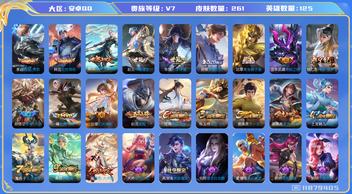 [11879405]V7 2典藏 13传说 125英雄 261皮肤 可修改实名 优质装备:鸣剑·曳影,弑枪猎影(韩信典藏),黄金狮子座,云鹰飞将(小将军),一念神魔,零号·赤焰,地狱之眼,淬星耀世,挚爱之约,神器·狴犴令 传说皮:乘龙·铭钟鼎(赵云年限),幻光神枪 珍宝阁皮:万物之道,优雅恋人,玩趣恶龙 限定皮:愿照·九州拓(澜年限),鸣野蒿,遇见飞天,高山流水,五谷丰年,梁祝,龙胆,李小龙,寅虎·赤拳(老虎年限) 史诗皮:鸭鸭历险记-刘禅,化蝶舞,星界战将,龙之律动,茶境仙,琥珀纪元伽罗,百相守梦-百里守约,百相守梦-黄忠,紫霞仙子,电玩小子(小书包),白龙吟,黄金分割率,特工魅影,千年之狐,百相守梦(关羽),电玩·爆裂旋风,江河有灵,雪夜绮愿(周瑜),高渐离燃音魔法,蒙恬荣光圣徽,偶像歌手,龙骑士(小龙虾),暗夜猫娘,无限星赏官,青蛇,末日机甲-吕布,猫狗日记-孙策,猫狗日记-大乔,时之恋人-孙尚香,乱世虎臣,节奏热浪,修罗,女仆咖啡,摇滚巨星,水果甜心,绅士熊喵,天才门将,星夜王子,心灵骇客,功夫厨神,德古拉伯爵,暗隐猎兽者,幽灵船长,鬼剑武藏,暗渊魔法,心灵战警,乐园奇幻夜,天秀·启明,舞动绿茵,地狱岩魂,纤云弄巧,拒霜思,缤纷独角兽,乘风破浪,逐浪之夏,月团寄思,水晶猎龙者,曙光守护者,箭羽风息,金属风暴,原初追逐者,圣诞狂欢,圣诞恋歌,鹰眼统帅,魅力维加斯,黎明之约,赏金猎手,千筹问战,无心,未来纪元-赵云