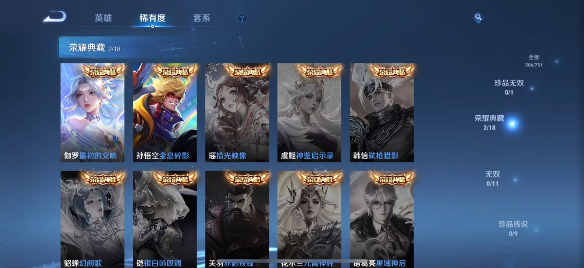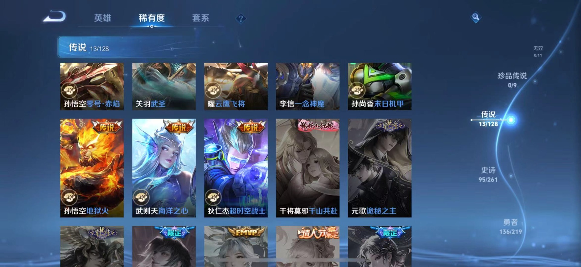 甄姬女儿国国王,伽罗天狼溯光者,孙膑天狼运算者,干将莫邪冰霜恋舞曲,牛魔奔雷神使,项羽霸王别姬,吕布御风骁将,诸葛亮时雨天司,公孙离祈雪灵祝,裴擒虎李小龙,上官婉儿梁祝,花木兰青春决赛季,马可波罗逐梦之星,猪八戒猪悟能,孙悟空孙行者,孙悟空大圣娶亲,芈月白晶晶,雅典娜神奇女侠,蔡文姬奇迹圣诞,虞姬霸王别姬,关羽武圣,关羽冰锋战神