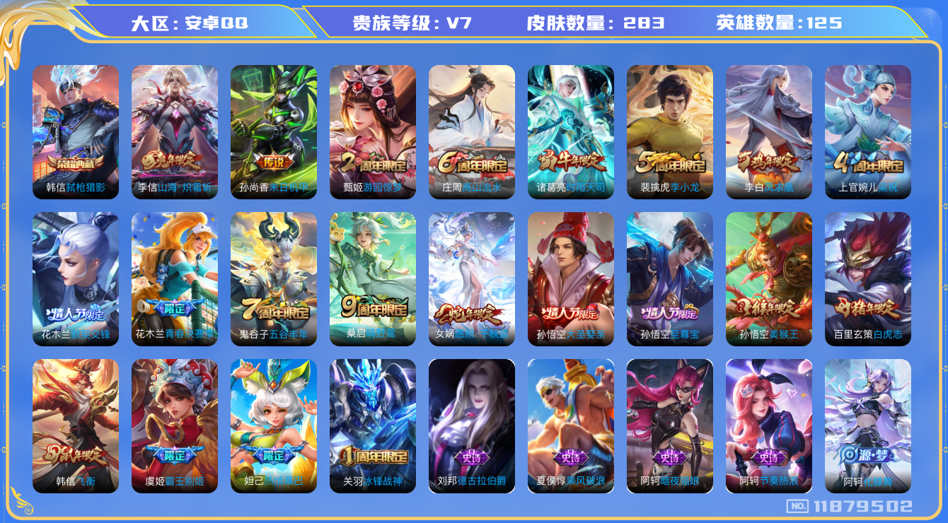 [11879502]V7 1典藏 7传说 125英雄 283皮肤 可修改实名 优质装备:弑枪猎影(韩信典藏),末日机甲-孙尚香(绿蚂蚱),山海·炽霜斩(李信年限) 珍宝阁皮:胡桃夹子,万物之道,女武神 限定皮:愿照·千秋盛(女娲年限),鸣野蒿,至尊宝,白虎志(电光耗子),凤求凰(白切鸡),时雨天司(水龙头),飞衡(韩信年限),高山流水,五谷丰年,冰锋战神,游园惊梦,梁祝,李小龙,霸王别姬-虞姬,默契交锋-花木兰,大圣娶亲,青春决赛季,热情桑巴,美猴王 史诗皮:器灵·浮梦炉,化蝶舞,星界战将,怒海争锋,百相守梦-黄忠,苍穹之光,电玩小子(小书包),白龙吟,黄金分割率,特工魅影,千年之狐,江河有灵,蒙恬荣光圣徽,偶像歌手,暗夜猫娘,冰冠公主,末日机甲-吕布,乱世虎臣,节奏热浪,摇滚巨星,水果甜心,天才门将,星夜王子,心灵骇客,功夫厨神,德古拉伯爵,暗隐猎兽者,幽灵船长,鬼剑武藏,心灵战警,舞动绿茵,地狱岩魂,缤纷独角兽,乘风破浪,逐浪之夏,水晶猎龙者,曙光守护者,箭羽风息,金属风暴,原初追逐者,圣诞狂欢,圣诞恋歌,鹰眼统帅,黎明之约