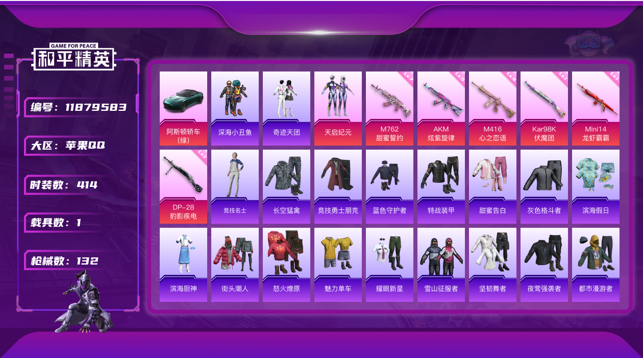 [11879583]1粉装 6特效枪 1载具 4印记 可二次 可修改实名 优质装备:阿斯顿·马丁DBS(绿),Mini14龙虾霸霸,M762甜蜜誓约,AKM炫紫旋律,Kar98K伏魔团,M416心之恋语,天启纪元,七级M762-甜蜜誓约 热门装扮:奇迹天团,深海小丑鱼 稀有枪皮:DP-28-豹影疾电 五级特效枪:五级Kar98K-伏魔团 四级特效枪:四级M416-心之恋语 一级特效枪:一级Kar98K-伏魔团,一级Mini14-龙虾霸霸,一级DP-28-豹影疾电 紫色装扮:SS23特训,幻彩翩翩,妙红点点,娇憨猪猪,萌趣咩咩,SS21特训,SS5特训,冰原使者,,冰川特警,冰焰天使,凛冬战士,北国孤狼,梦起落英,青春冒险家,光影梦想家,潮流游乐家,SS15特训,SS16特训,星河入梦,银白舞王,SS13特训,治愈之星,科技之星,SS14特训,萌趣颜团子,SS19特训,吉莉礼服,瑞龙福将,团圆交子,SS17特训,都市漫游者,金鼠迎春,长空猛禽,雪山征服者,雪山精英,霓虹街区,翡翠奔狼,耀眼新星,蓝色守护者,虎虎生威吉莉,街头潮人,超能勇士,跃动心情,飞行日记,魅力单车,鹤鸣,龙的传人,格斗先锋,滨海假日,圣诞大吉,坚韧舞者,夏日音浪,夜莺强袭者,怒火燎原,滨海厨神,甜蜜菠萝,疯狂小兔子,破蛋小黄鸡,甜蜜告白,福星高照,竞技勇士朋克,甜蜜熊情侣,牛气冲天,灰色格斗者,热血青春,牛气满满,特战装甲,镭射皇者,玉兔迎春,竞技名士,SS25特训,金羽特工,精神漫游,炽焰拳师,格斗专家,SS6特训,闪耀星光,黑色刀锋,核芯基因,SS7特训,清香五月粽,软嫩糖心蛋,深蓝冒险家,迷域探索者,拳皇97草薙京,云纹魔法士,SS8特训,青龙圣者,原初圣火,逆风勇士,SS12特训,韶华初心,纯白誓言,众神之王,智慧之神,SS9特训,风华少年志,白月香洋装,SS10特训,暗夜契约,SS11特训,萌黄之夏,金耀舞者,装甲骑士,丛林猎人,传奇侦探,奇趣企鹅,海上生明月 优质战备:至尊龙雀降落伞,龙虾霸霸降落伞,炫紫旋律降落伞,马卡龙降落伞,阿狸红降落伞,四圣焕新降落伞,飞行器-绮梦青鸾,齐天大圣降落伞