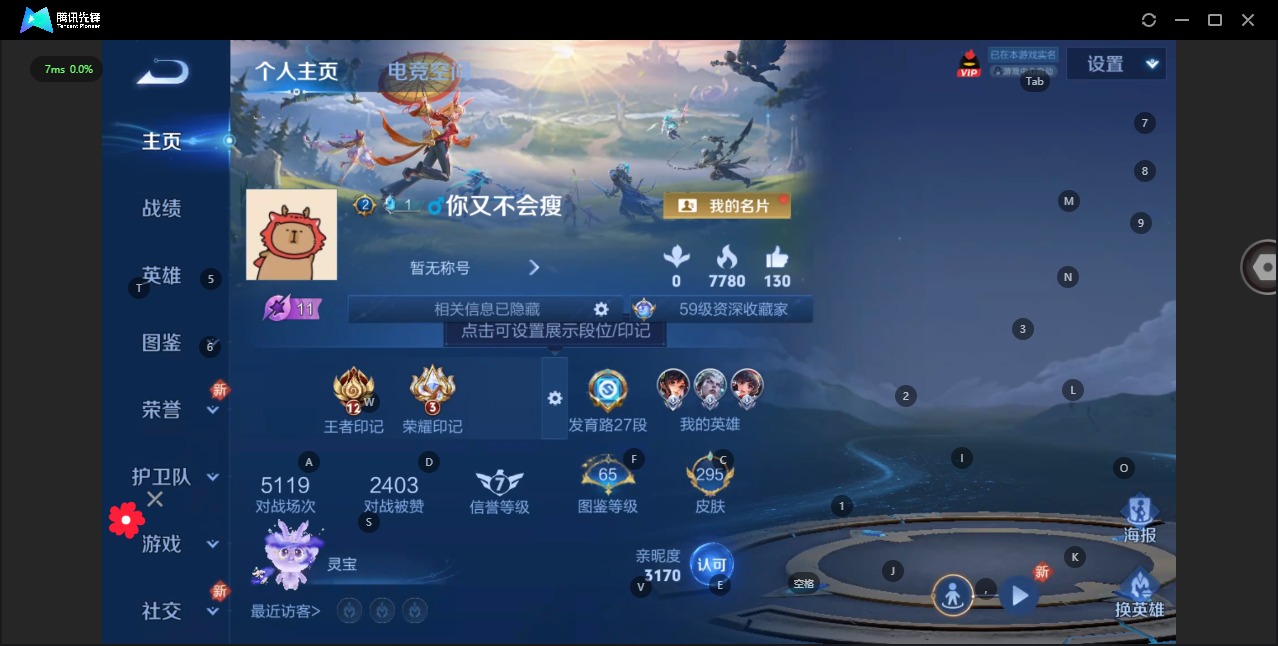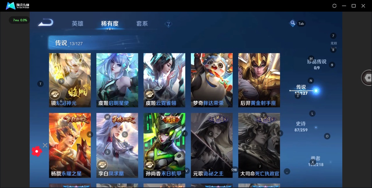 - PX_2088151-实名: 可修改 贵族等级: V7 英雄数: 122 皮肤数: 242 传说皮: 黄金射手座,挚爱之约,神器·狴犴令,山海·炽霜斩,燃星之曲,浮生妄,幻光神枪 限定皮: 李小龙,奔雷神使,梁祝,龙胆,寅虎·御盾,武陵仙君,高山流水,猪悟能,时之祈愿-云中君,时之祈愿-瑶,百木心枪,玉兔公主,匿光决锋者,深海之息,五谷丰年,鸣野蒿,逐霄战戟,愿照·山河定