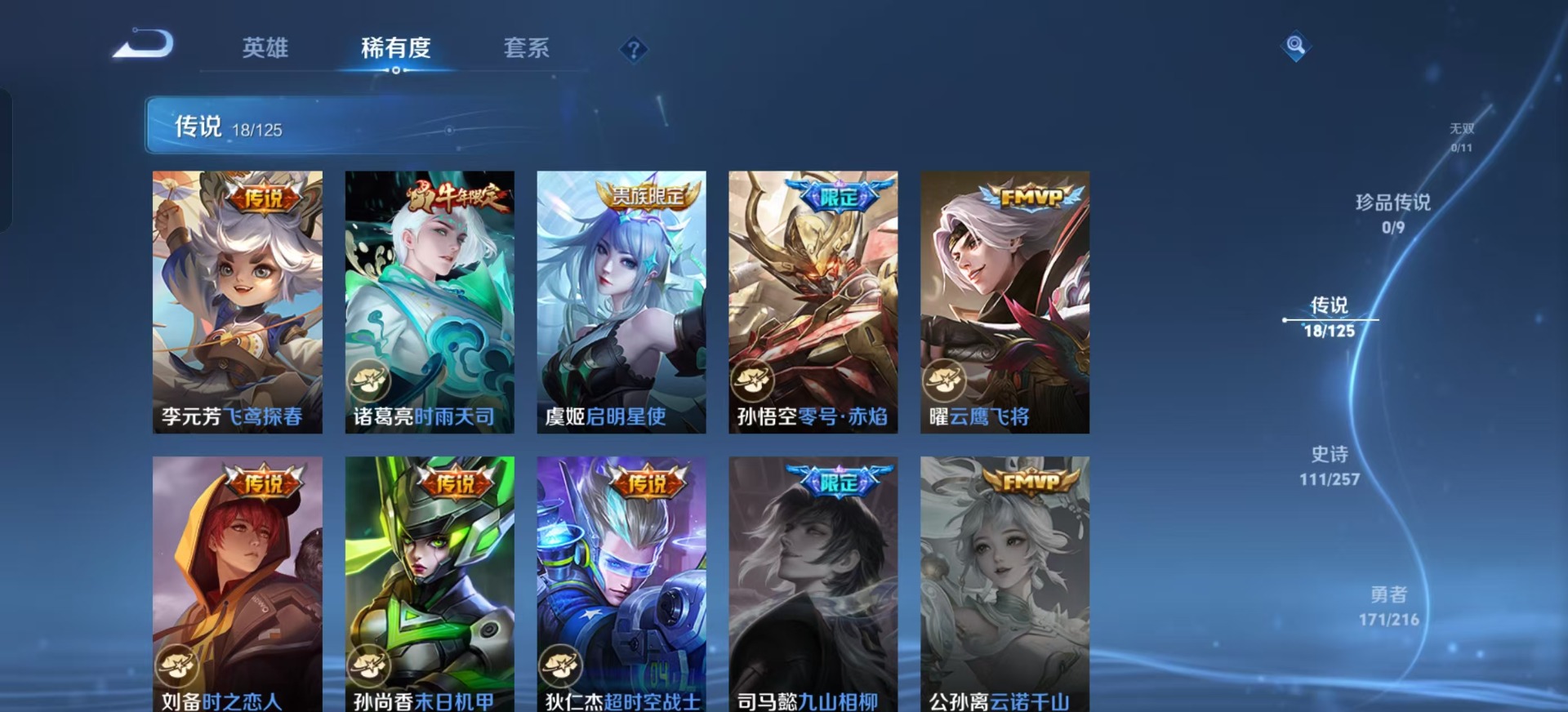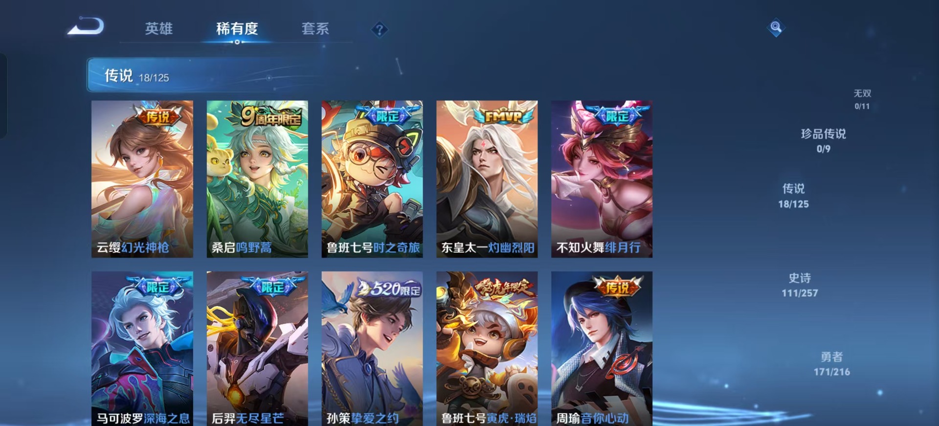 - PX_2096217-81 安卓QQ/最强王者/272皮肤/125英雄/1典藏/0珍品无双/0无双/1珍品传说/12传说/68史诗/9稀有英雄 【1 珍品传说】时之奇旅 孙策, 【1 典藏皮肤】鸣剑·曳影 李白, 【12 传说皮肤】武圣 关羽,无双飞将 马超,地狱火 孙悟空,云鹰飞将 曜,霜月吟 露娜,久胜战神 干将莫邪,绛天战甲 铠,霜北刀 夏侯惇,冥王哈迪斯 铠,黄金白羊座 张良,幻光神枪 云