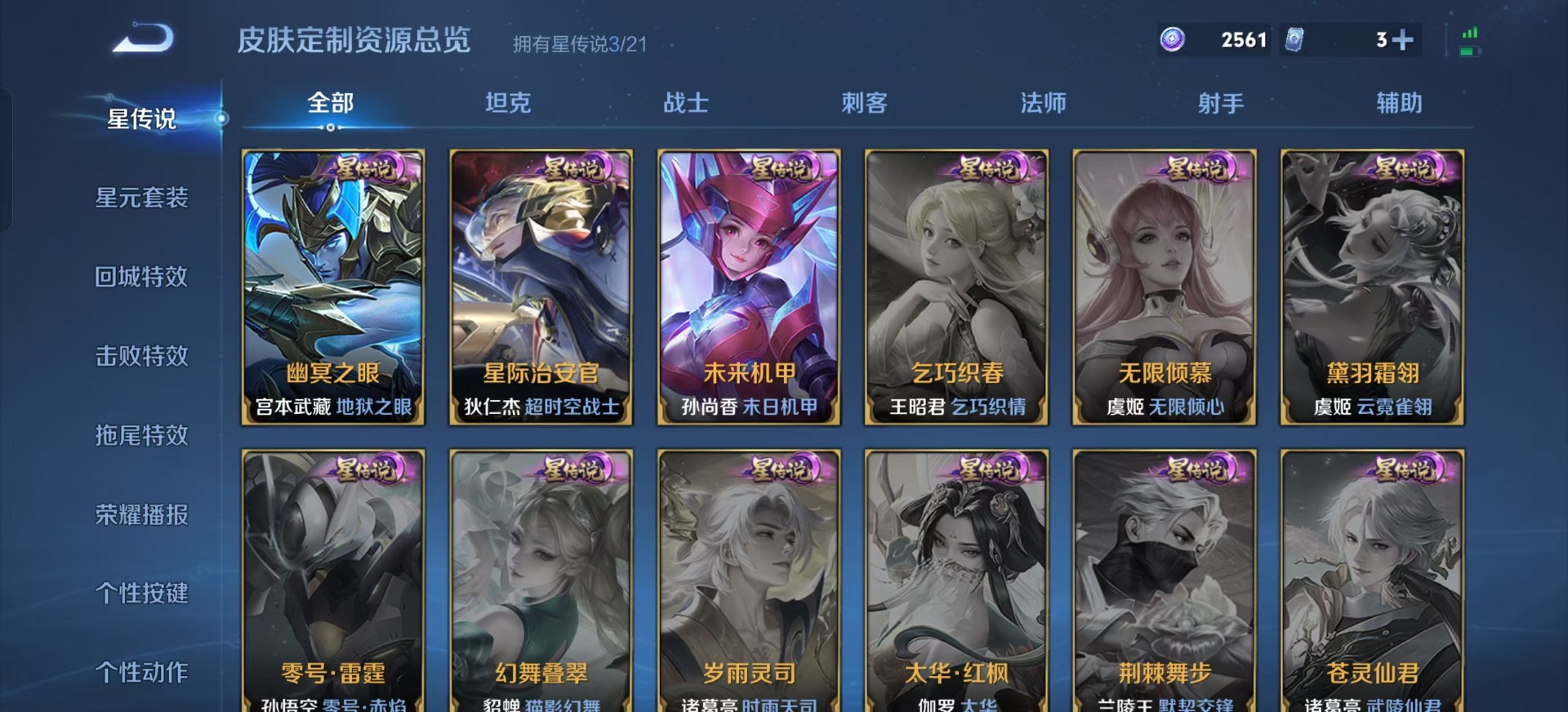 铠青龙志,伽罗天狼溯光者,干将莫邪冰霜恋舞曲,不知火舞绯月行,鲁班七号乒乒小将,鲁班七号寅虎·瑞焰,后羿无尽星芒,后羿辉光之辰,诸葛亮时雨天司,裴擒虎李小龙,上官婉儿梁祝,花木兰瑞麟志,马可波罗逐梦之星,马可波罗山海·玄木吟,马可波罗深海之息,西施至美·乘鲤谣,桑启鸣野蒿,猪八戒猪悟能,孙悟空大圣娶亲,韩信傲雪梅枪