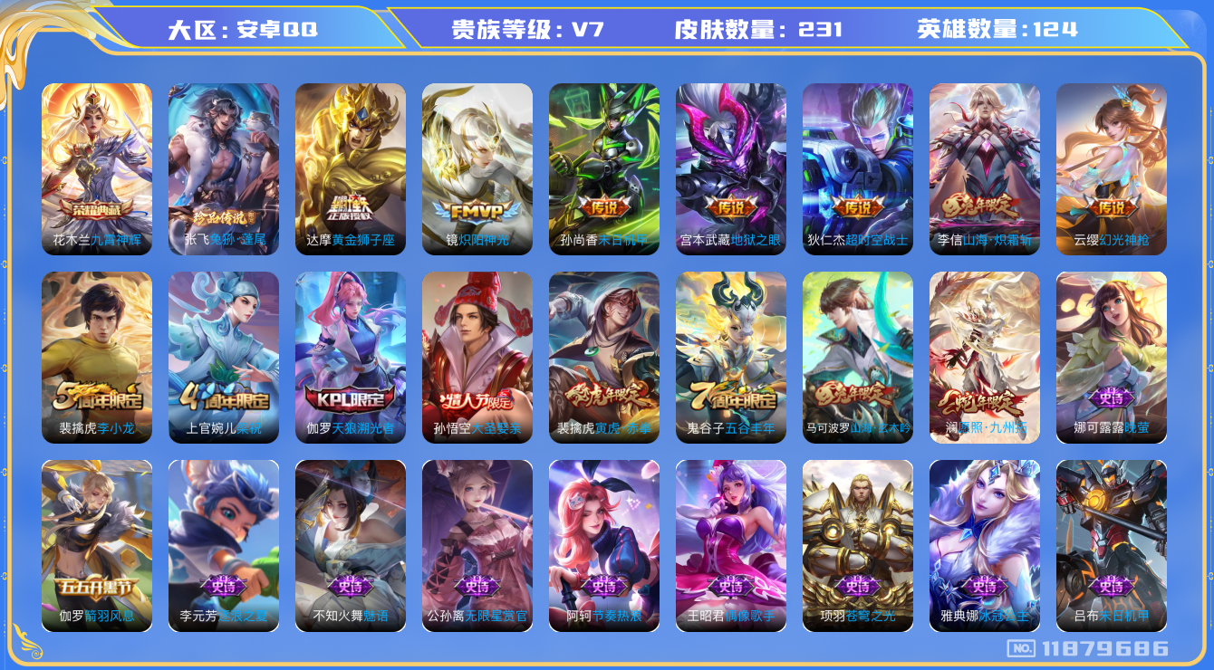 [11879686]【商品标题】:安卓Q-V7-最强王者段位-124英雄-231皮肤-1典藏-0珍品无双-0无双-1珍品传说-9传说-73史诗