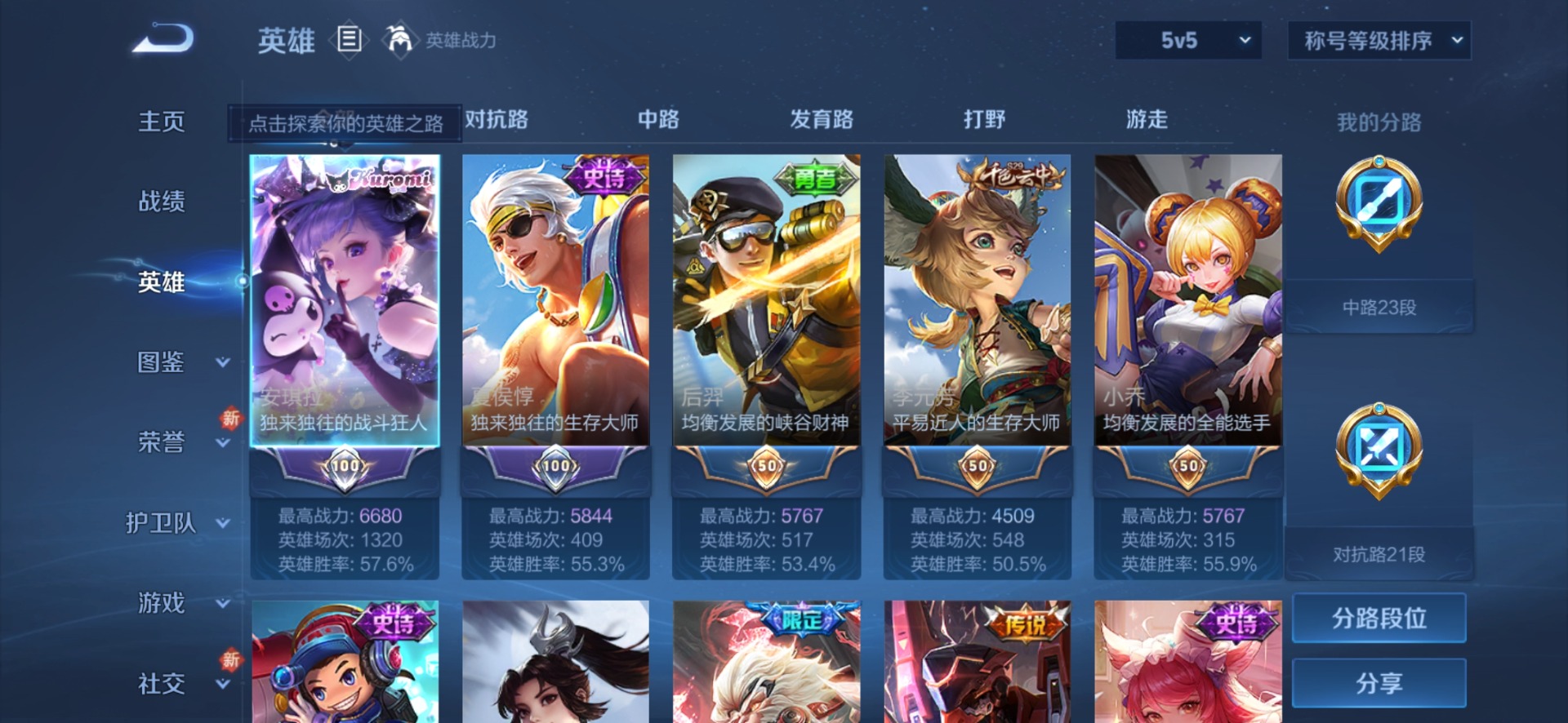 - PX_2112157-贵族等级: V4 英雄数: 122 皮肤数: 109 传说皮: 澜逐花归海,幻光神枪 限定皮: 李小龙,鸣野蒿,愿照·九州拓