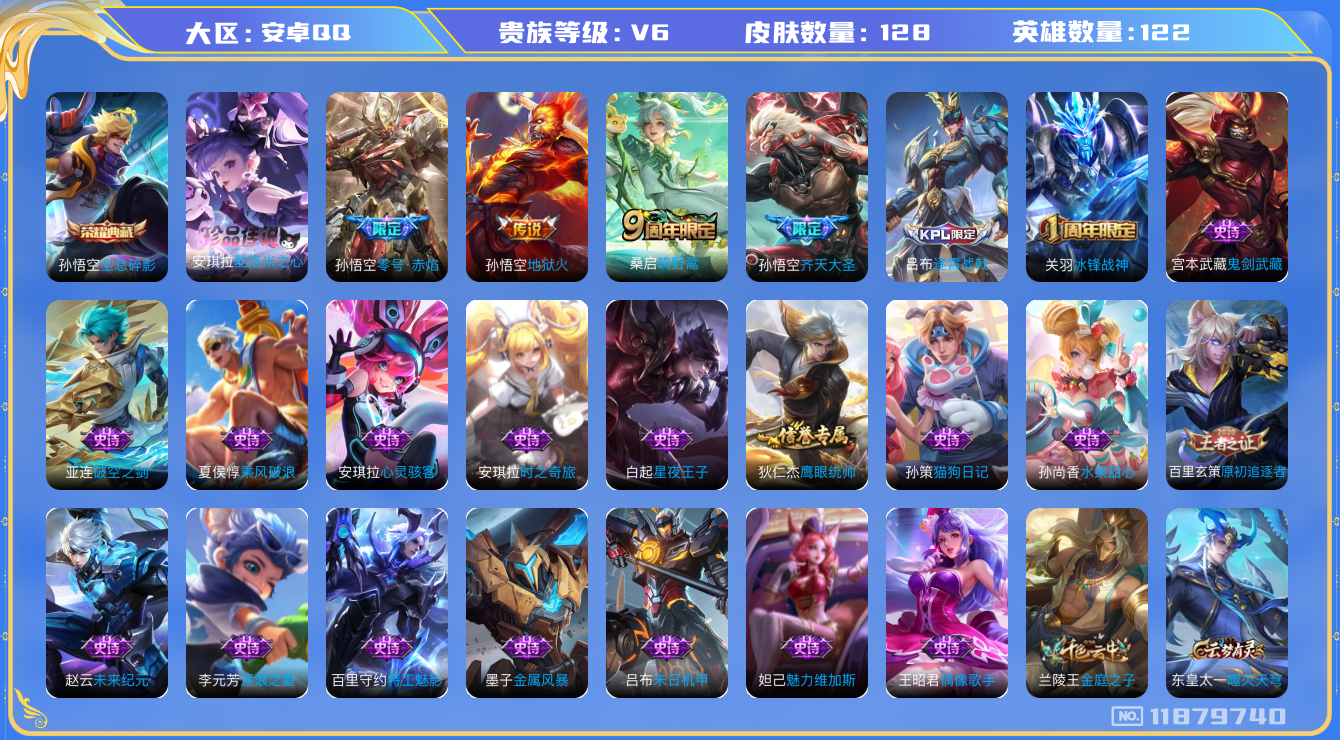 - [11523321]V8 1典藏 4珍品传说 18传说 123英雄 211皮肤 可修改实名 女号 优质装备:九霄神辉(木兰典藏),怪盗基德,酷洛米之心,大耳狗之梦,黄金射手座,冠军飞将,炽阳神光,仲夏夜之梦(大飞蛾),游龙清影(小青龙),无双飞将,妄想实况,霜月吟 珍品传说:时之奇旅-孙策 传说皮:续相思,幻光神枪 珍宝阁皮:蔷薇恋人 限定皮:愿照·九州拓(澜年限),愿照·福禄聚(蔡文姬年限),愿照·岁时盈(虞姬年限),愿照·山河定(司空震年限),愿照·众生和(妲己年限),愿照·千秋盛(女娲年限),鸣野蒿,高山流水 史诗皮:鸭鸭历险记-刘禅,绮世丹青,化蝶舞,龙之律动,百相守梦-周瑜,茶境仙,破空之剑,蒙犽顽岩魄,怒海争锋,蔬乡物语(鲁班七号),琥珀纪元伽罗,百相守梦-百里守约,百相守梦-黄忠,遇见神鹿,紫霞仙子,永昼,江河有灵,雪夜绮愿(周瑜),偶像歌手,无限星赏官,末日机甲-吕布,猫狗日记-孙策,时之恋人-孙尚香,节奏热浪,摇滚巨星,水果甜心,天才门将,心灵骇客,暗隐猎兽者,幽灵船长,鬼剑武藏,舞动绿茵,缤纷独角兽,乘风破浪,逐浪之夏,水晶猎龙者,箭羽风息,金属风暴,圣诞狂欢,圣诞恋歌,鹰眼统帅,魅力维加斯,未来纪元-赵云