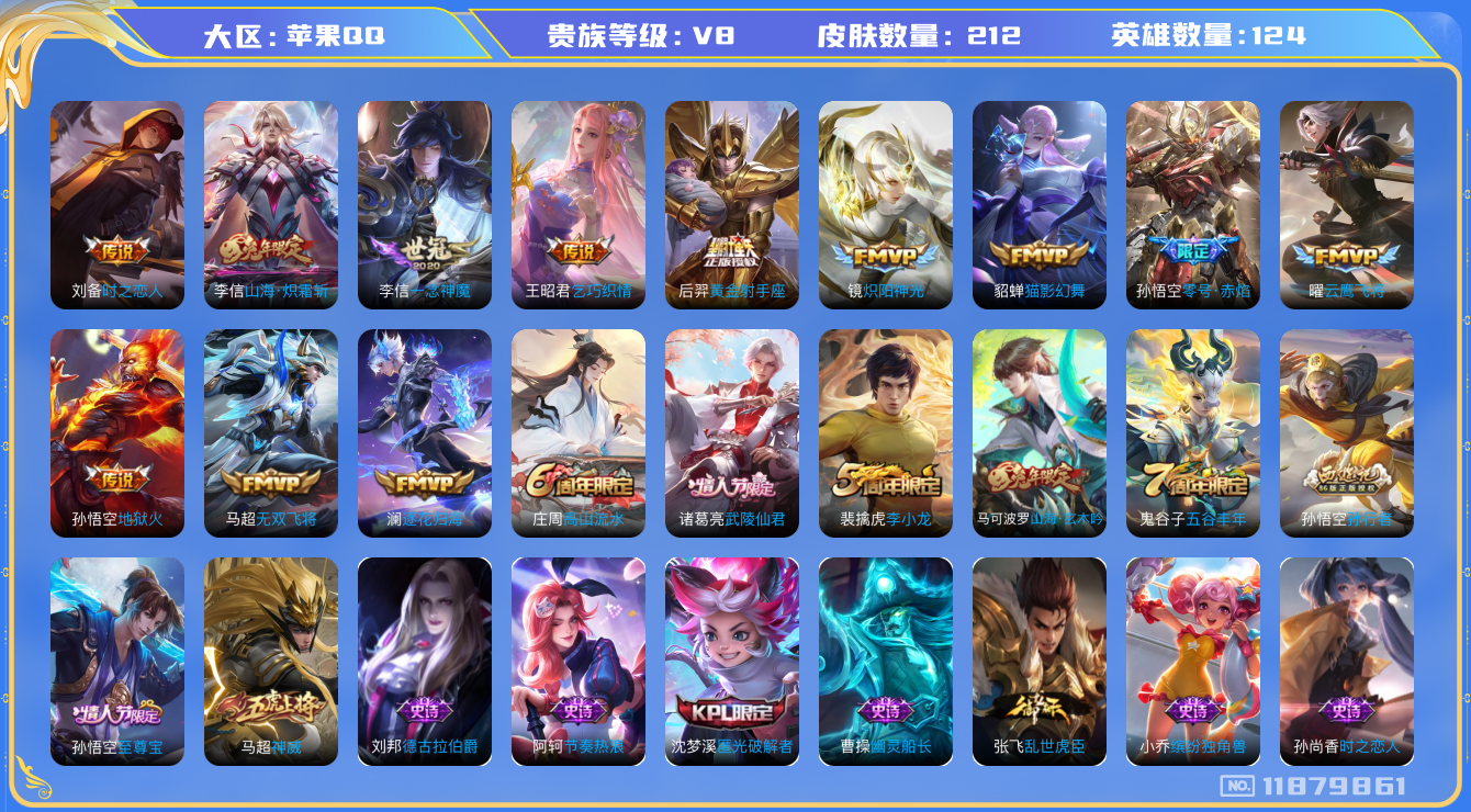 - [11607936]V8 1典藏 1珍品传说 17传说 124英雄 182皮肤 可修改实名 优质装备:银白咏叹调(倪克斯侍卫),一念神魔,时之恋人-刘备(电焊工),浮生妄,惊梅引,遇见神鼓,澜逐花归海,琥珀纪元铠 珍品传说:时之奇旅-孙策 传说皮:乘龙·问璇玑(孙尚香年限),乘龙·铭钟鼎(赵云年限),乘龙·淬吴钩(孙策年限),祥瑞亨通 珍宝阁皮:蔷薇恋人 限定皮:愿照·九州拓(澜年限),愿照·山河定(司空震年限),逐霄战戟,鸣野蒿,夏侯惇霜北刀,傲雪梅枪,影龙天霄,李小龙,如梦令-后羿,乒乒小将,山海·玄木吟(马可年限) 史诗皮:鸭鸭历险记-刘禅,谪仙醉月,茶境仙,破空之剑,涂山红红,东方月初,蒙犽顽岩魄,琥珀纪元伽罗,百相守梦-百里守约,星界特工,遇见神鹿,紫霞仙子,特工魅影,江河有灵,百解令(蒙犽),高渐离燃音魔法,冰冠公主,乱世虎臣,节奏热浪,摇滚巨星,水果甜心,星夜王子,功夫厨神,暗隐猎兽者,幽灵船长,鬼剑武藏,舞动绿茵,地狱岩魂,纤云弄巧,曙光守护者,箭羽风息,金属风暴,鹰眼统帅,魅力维加斯,赏金猎手,未来纪元-赵云