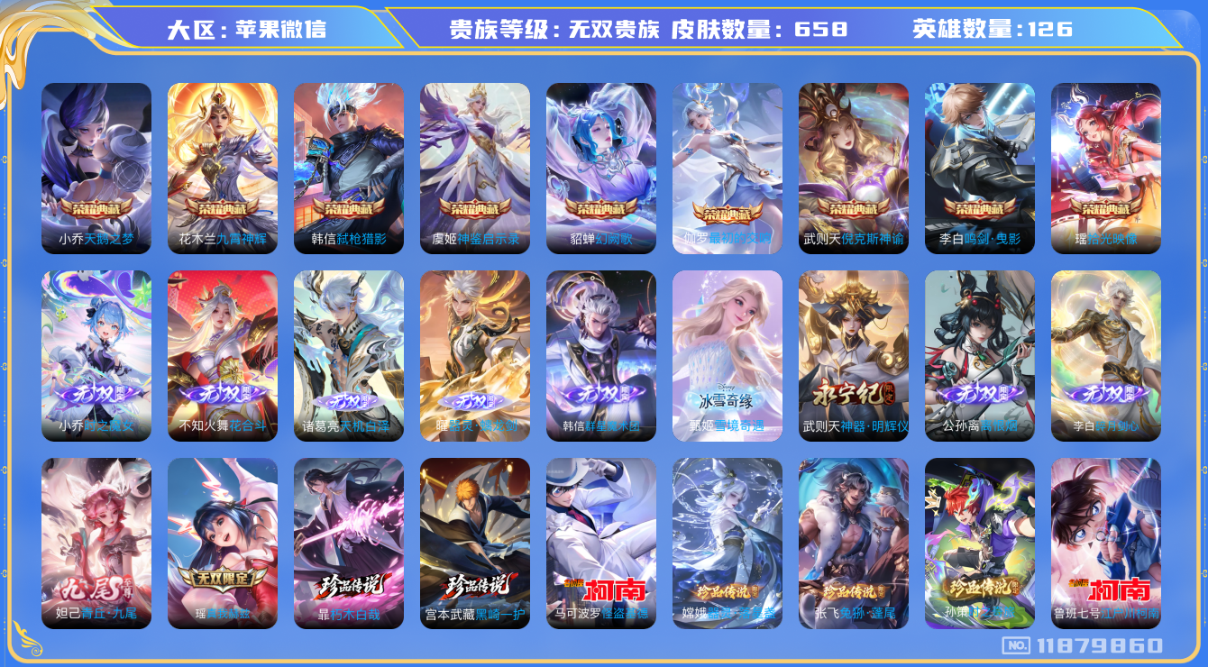 [11879860]无双贵族 9典藏 11无双 9珍品传说 119传说 126英雄 658皮肤 典藏英雄武则天 背包有颗荣耀水晶 可修改实名 优质装备:天鹅之梦(小乔典藏),倪克斯神谕(宇宙婆娘),鸣剑·曳影,九霄神辉(木兰典藏),幻阙歌(貂蝉典藏),弑枪猎影(韩信典藏),真我赫兹(瑶)(瑶无双),神器·明辉仪,青丘·九尾(妲己无双),碎月剑心(李白无双),神鉴启示录,小乔时之魔女(小乔无双),韩信群星魔术团(韩信无双),花合斗,离恨烟(公孙离无双),拾光映像(瑶典藏),雪境奇遇-甄姬,器灵·螭龙剑,最初的交响(伽罗典藏),天机白泽,江户川柯南,怪盗基德,器灵·落星盏,酷洛米之心,大耳狗之梦,朽木白哉,黑崎一护,黄金狮子座,黄金射手座,冠军飞将,云鹰飞将(小将军),绛天战甲(鸡嘴战神),黄金白羊座,猫影幻舞,久胜战神,炽阳神光,一念神魔,云霓雀翎,末日机甲-孙尚香(绿蚂蚱),地狱火,仲夏夜之梦(大飞蛾),音你心动-小乔,海洋之心,地狱之眼,飞鸢探春,音你心动-周瑜,胖达荣荣,李逍遥,乞巧织情,时之恋人-刘备(电焊工),游龙清影(小青龙),淬星耀世,遇见胡旋,末日机甲-孙策,花朝如约(花篮子),挚爱之约,挚爱花嫁,无双飞将,碎云,神器·狴犴令,神器·明辉仪,山海·炽霜斩(李信年限),山海·琳琅生(小乔年限),山海·苍雷引(电光曜子),炽翼辉光(娃娃菜牛角包),燃星之曲,画中仙,浮生妄,记忆之芯(机甲兔),青丘·九尾,百相守梦(张飞),追逃游戏(亚瑟),追逃游戏(安琪拉),电玩·雷克斯,鹤羽星尊,灼幽烈阳,妄想实况,妄想奇谈,鹤归松栖(云缨),惊梅引,遇见神鼓,鲁班七号-时之奇旅,大乔-时之奇旅,永恒水手月亮,夜礼服假面,小动物乐团,霜月吟,澜逐花归海,艾琳觅芳踪,琥珀纪元铠,琥珀纪元马超,金乌负日,黄金天蝎座,云中君群星魔术团,朵莉亚心动手记,牧神诗旅,玄雷天君,千劫归真,诡秘之主,涂山容容 珍品传说:时之奇旅-孙策,兔狲·蓬尾 传说皮:乘龙·问璇玑(孙尚香年限),乘龙·铭钟鼎(赵云年限),乘龙·淬吴钩(孙策年限),貂蝉曦玄引,吕布曦玄引,典韦战鼓燎原,落雪白狼,死亡执政官,九山相柳,云诺千山,铠冥王哈迪斯,续相思,星之鸣奏,祥瑞亨通,幻光神枪 珍宝阁皮:妄想食味,胡桃夹子,万物之道,女武神 愿照·福禄聚(蔡文姬年限),愿照·岁时盈(虞姬年限),愿照·山河定(司空震年限