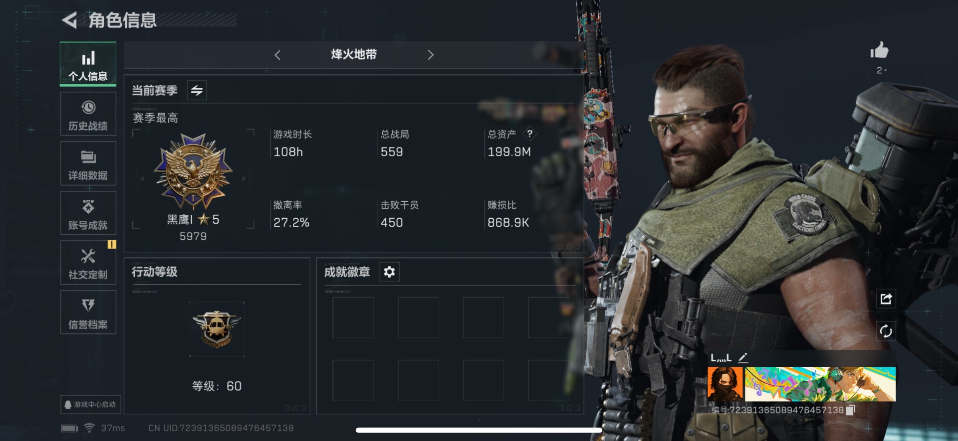 [11879924]总资产:199.9M 9传说枪械 哈夫币:42.094K 可二次 可修改实名 优质装备:顶级安全箱(3x3) 烽火地带段位:黑鹰 传说武器皮肤:M4A1突击步枪-阿米娅,CAR-15突击步枪-阿米娅,复合弓-黑-天际线,AWM狙击步枪-捞点薯条,腾龙突击步枪-捞点薯条,93R-捞点薯条,AK-12突击步枪-特斯拉线圈,UZI冲锋枪-特斯拉线圈,勇士冲锋枪-能天使-午夜邮差 史诗武器皮肤:SVD狙击步枪-暗夜猎手,M16A4突击步枪-竞赛选手,MP5冲锋枪-深海恐惧,AKM突击步枪-林中猎手,M1014霰弹枪-林中猎手,SV-98狙击步枪-林中猎手,M250通用机枪-囚徒,SCAR-H战斗步枪-囚徒
