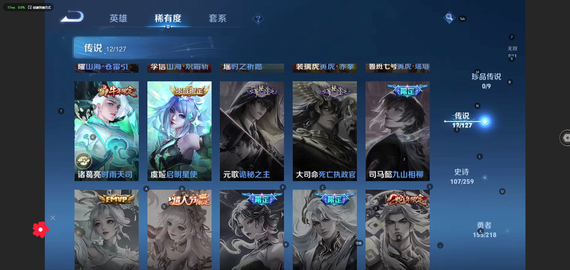 - PX_2108013-Q/非凡王者/272皮肤/125英雄/1典藏/0珍品无双/0无双/0珍品传说/31传说/85史诗/9稀有英雄 【1 典藏皮肤】九霄神辉 花木兰, 【31 传说皮肤】鹤归松栖 云缨,启明星使 虞姬,逐花归海 澜,无双飞将 马超,白虎志 百里玄策,云鹰飞将 曜,夜礼服假面 狄仁杰,深海之息 马可波罗,诗剑行 李白,记忆之芯 公孙离,地狱之眼 宫本武藏,炽阳神光 镜,黄金射手座 后