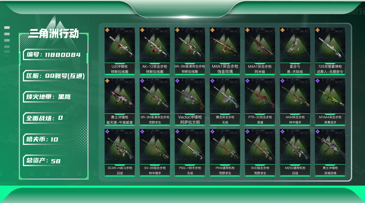[11880084]总资产:58.3M 1干员外观 8传说枪械 哈夫币:10.593K 高级安全箱(2×3)9.15号到期 可二次 可修改实名 烽火地带段位:黑鹰 全面战场段位:列兵 传说武器皮肤:M4A1突击步枪-阿米娅,复合弓-黑-天际线,AK-12突击步枪-特斯拉线圈,SR-3M紧凑突击步枪-特斯拉线圈,UZI冲锋枪-特斯拉线圈,勇士冲锋枪-能天使-午夜邮差,725双管霰弹枪-送葬人-无题密令,M4A1突击步枪-蚀金玫瑰 史诗武器皮肤:M16A4突击步枪-竞赛选手,PKM通用机枪-荒野求生,勇士冲锋枪-深海恐惧,AKM突击步枪-林中猎手,SR-3M紧凑突击步枪-荒野求生,M1014霰弹枪-林中猎手,SV-98狙击步枪-林中猎手,PTR-32突击步枪-英雄,SVD狙击步枪-荒野求生,M250通用机枪-囚徒,SCAR-H战斗步枪-囚徒,腾龙突击步枪-无垢,MP7冲锋枪-无垢,PSG-1射手步枪-无垢,Vector冲锋枪-阿萨拉文明 干员外观:红狼-蚀金玫瑰