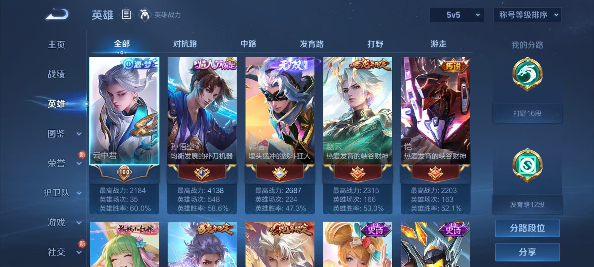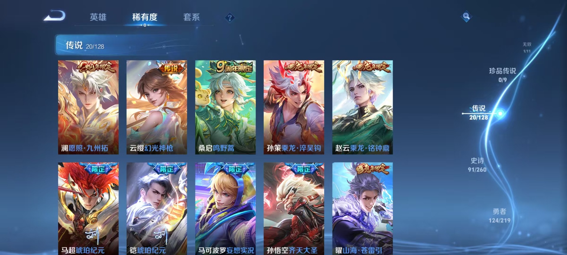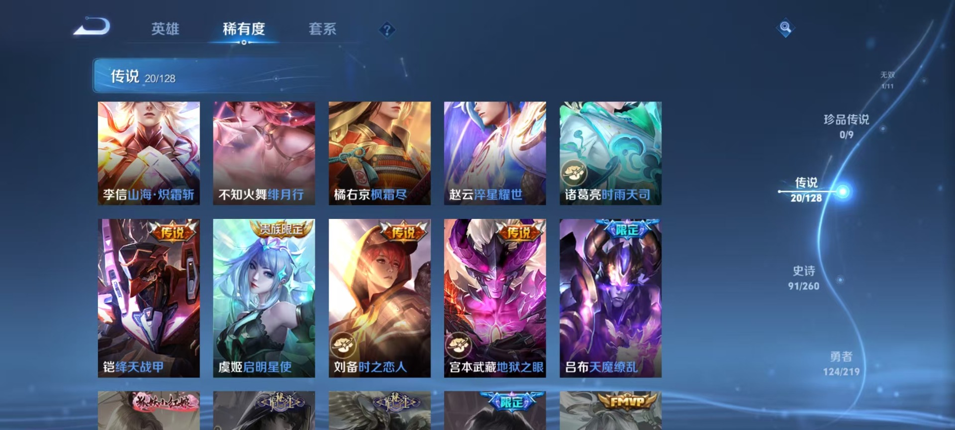 - [11547146]V7 1典藏 4传说 122英雄 203皮肤 可修改实名 优质装备:鸣剑·曳影,末日机甲-孙尚香(绿蚂蚱),地狱火,惊梅引 传说皮:幻光神枪 珍宝阁皮:优雅恋人,蔷薇恋人 限定皮:至尊宝,瑞麟志(木兰年限),高山流水,五谷丰年,梁祝,天狼绘梦者,李小龙,逐梦之影,猪悟能 史诗皮:黄金分割率,千年之狐,电玩·爆裂旋风,江河有灵,偶像歌手,魅语,冰冠公主,猫狗日记-孙策,修罗,女仆咖啡,水果甜心,绅士熊喵,星夜王子,心灵骇客,功夫厨神,德古拉伯爵,暗隐猎兽者,舞动绿茵,纤云弄巧,缤纷独角兽,乘风破浪,逐浪之夏,水晶猎龙者,金属风暴,原初追逐者,圣诞狂欢,圣诞恋歌,鹰眼统帅,王者之锤,魅力维加斯,黎明之约,未来纪元-赵云