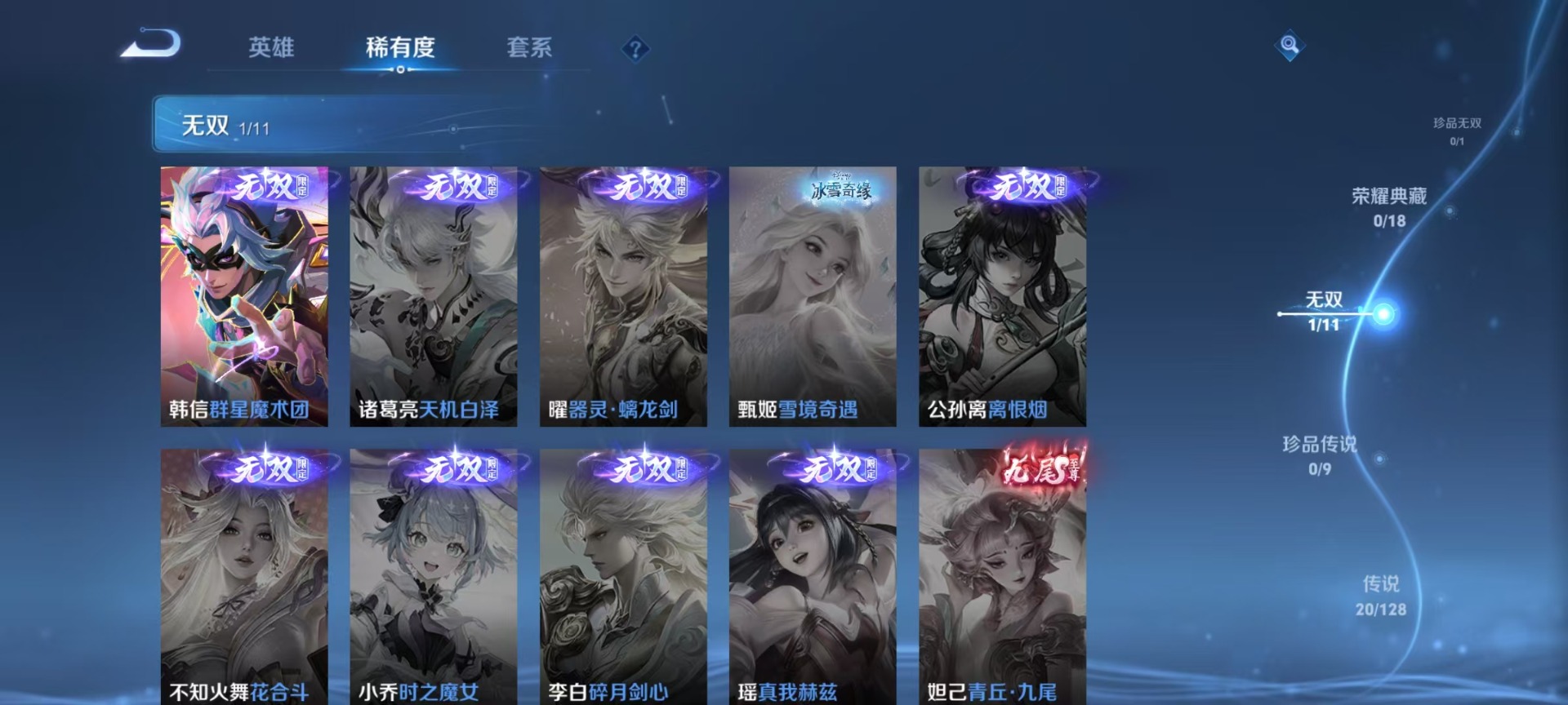 赵云百木心枪,干将莫邪冰霜恋舞曲,不知火舞绯月行,吕布御风骁将,后羿如梦令,诸葛亮时雨天司,公孙离玉兔公主,裴擒虎李小龙,艾琳陌上桑,桑启鸣野蒿,孙悟空孙行者,孙悟空至尊宝,马超神威,赵云引擎之心,韩信傲雪梅枪,澜愿照·九州拓,橘右京枫霜尽