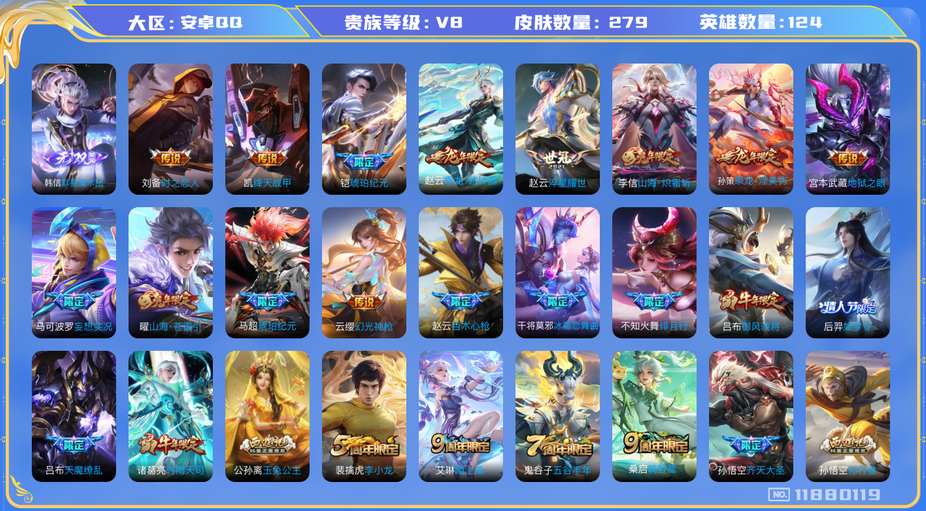 [11880119]V8 1无双 20传说 124英雄 279皮肤 可修改实名 女号 优质装备:韩信群星魔术团(韩信无双),绛天战甲(鸡嘴战神),地狱之眼,时之恋人-刘备(电焊工),淬星耀世,山海·炽霜斩(李信年限),山海·苍雷引(电光曜子),妄想实况,琥珀纪元铠,琥珀纪元马超,涂山容容 传说皮:乘龙·铭钟鼎(赵云年限),乘龙·淬吴钩(孙策年限),幻光神枪 珍宝阁皮:妄想食味,玩趣恶龙 限定皮:愿照·九州拓(澜年限),陌上桑,鸣野蒿,至尊宝,傲雪梅枪,绯月行,时雨天司(水龙头),神威(电光马子),齐天大圣,五谷丰年,御风骁将(吕布年限),李小龙,如梦令-后羿,孙行者,引擎之心,天魔缭乱,冰霜恋舞曲,百木心枪,玉兔公主,枫霜尽 史诗皮:器灵·浮梦炉,化蝶舞,灵蛊蚀心,谪仙醉月,龙之律动,百相守梦-周瑜,怒海争锋,撼地雄心,破空之剑,琥珀纪元伽罗,蔬乡物语(鲁班七号),百相守梦-黄忠,织梦人,紫霞仙子,苍穹之光,黄金分割率,特工魅影,千年之狐,永昼,江河有灵,百解令(蒙犽),高渐离燃音魔法,冰冠公主,青蛇,偶像歌手,晚萤,电玩·爆裂旋风,暗夜猫娘,龙骑士(小龙虾),末日机甲-吕布,猫狗日记-孙策,猫狗日记-大乔,乱世虎臣,节奏热浪,女仆咖啡,摇滚巨星,水果甜心,绅士熊喵,星夜王子,功夫厨神,德古拉伯爵,暗隐猎兽者,幽灵船长,鬼剑武藏,心灵战警,舞动绿茵,地狱岩魂,纤云弄巧,繁星吟游(呼啦呼啦),拒霜思,缤纷独角兽,乘风破浪,逐浪之夏,月团寄思,水晶猎龙者,曙光守护者,金属风暴,圣诞恋歌,鹰眼统帅,魅力维加斯,赏金猎手,未来纪元-赵云