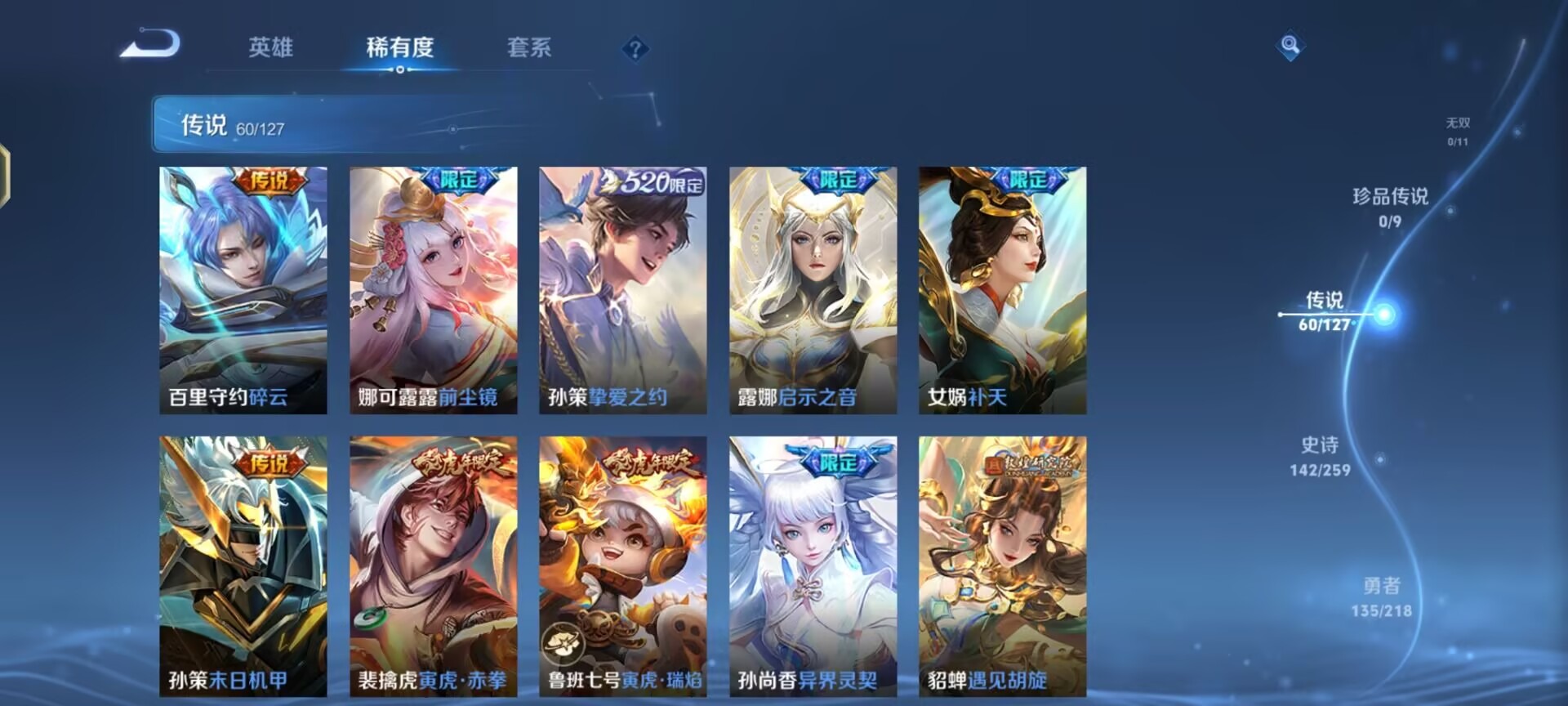 大乔白鹤梁神女,甄姬女儿国国王,伽罗天狼溯光者,伽罗太华,孙膑寅虎·展翼,孙尚香异界灵契,不知火舞绯月行,鲁班七号乒乒小将,鲁班七号寅虎·瑞焰,吕布御风骁将,后羿如梦令,露娜启示之音,露娜一生所爱,镜匿光追影者,周瑜真爱至上,诸葛亮时雨天司,杨玉环寅虎·心曲,公孙离祈雪灵祝,兰陵王默契交锋,公孙离玉兔公主,司空震愿照·山河定,公孙离蜜橘之夏,裴擒虎李小龙,裴擒虎天狼狩猎者,裴擒虎寅虎·赤拳,上官婉儿梁祝,上官婉儿神器·万象笔,花木兰默契交锋,花木兰青春决赛季,马可波罗逐梦之星,马可波罗山海·玄木吟,艾琳陌上桑,桑启鸣野蒿,猪八戒猪悟能,女娲补天,女娲愿照·千秋盛,孙悟空孙行者,芈月白晶晶,百里玄策白虎志,马超神威,云中君时之祈愿,妲己愿照·众生和,韩信傲雪梅枪,韩信逐梦之影,百里守约朱雀志,蔡文姬愿照·福禄聚,澜愿照·九州拓,虞姬霸王别姬,虞姬愿照·岁时盈,娜可露露前尘镜,王昭君凤凰于飞,关羽武圣