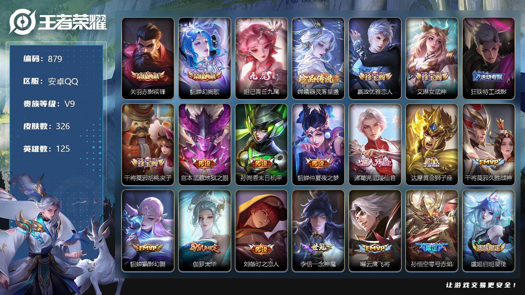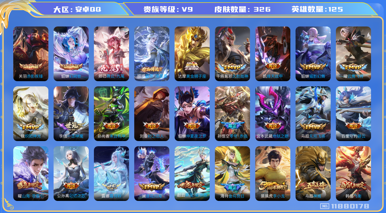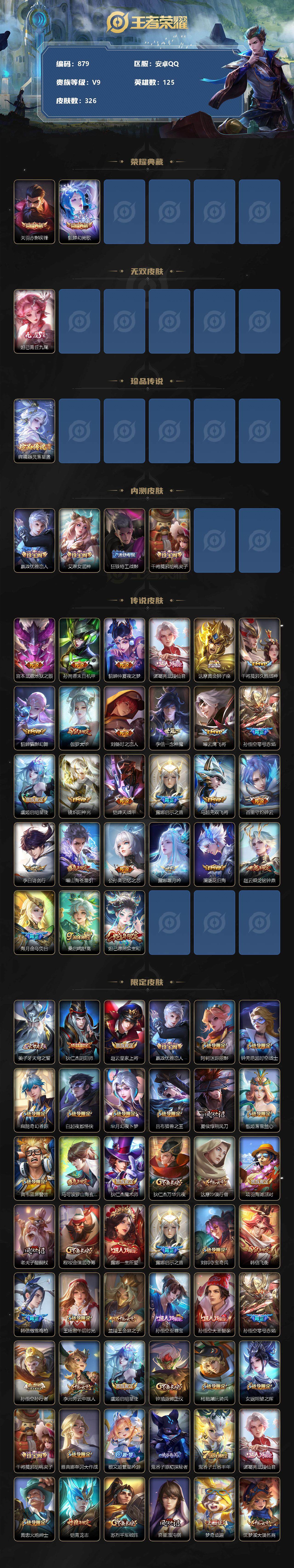 [11880178]【商品标题】:安卓Q-V9-永恒钻石I段位-125英雄-326皮肤-2典藏-0珍品无双-1无双-1珍品传说-27传说-94史诗
