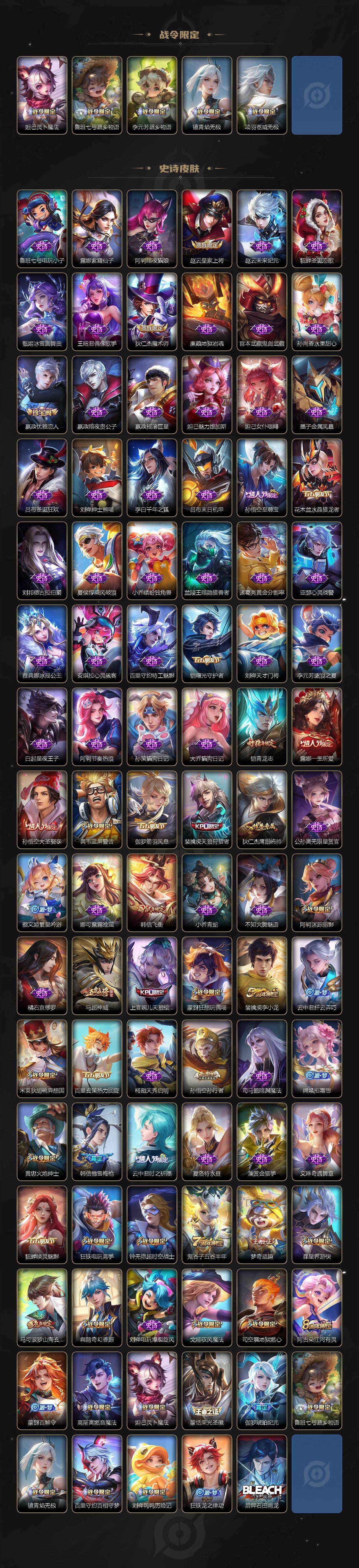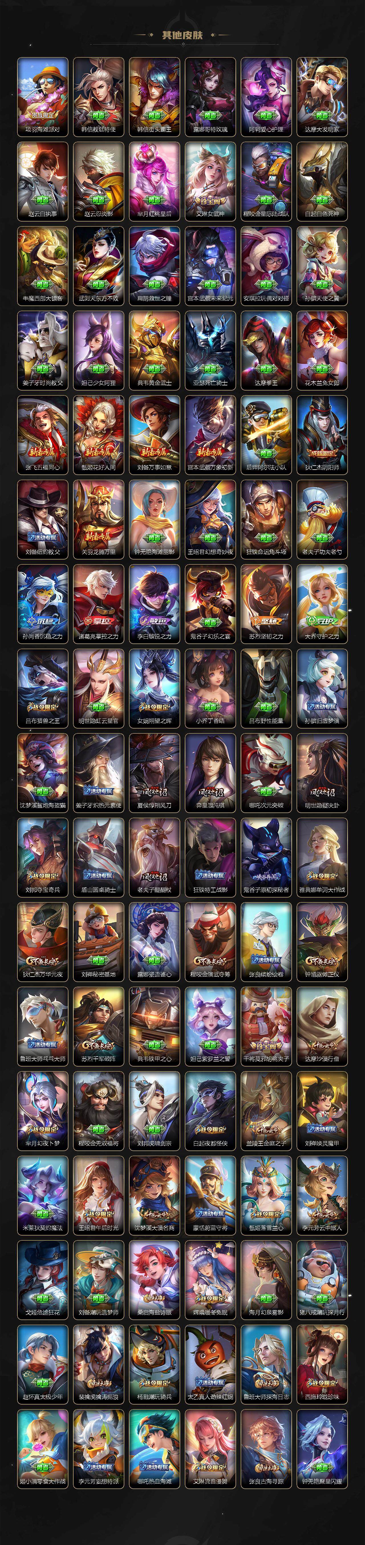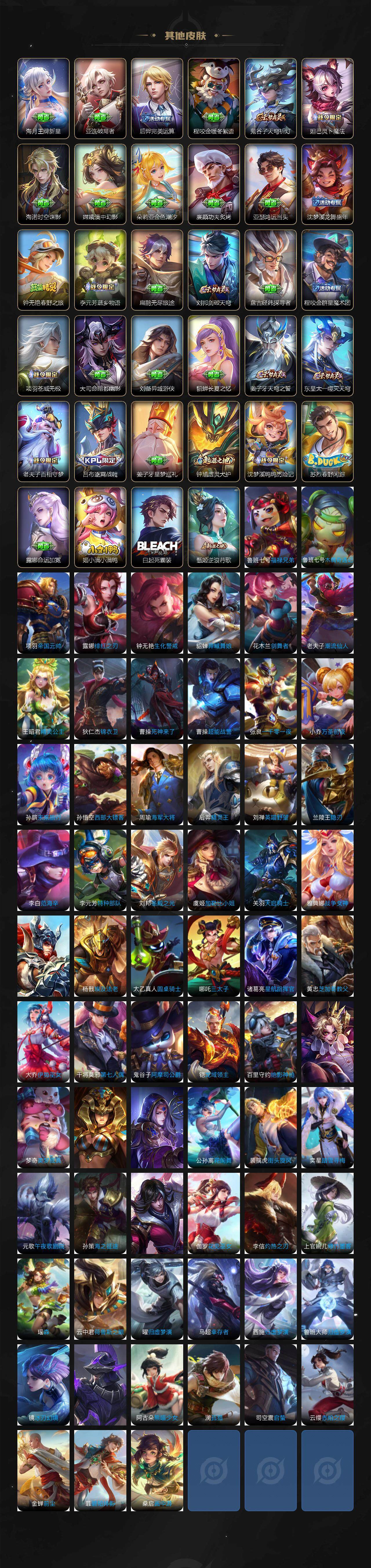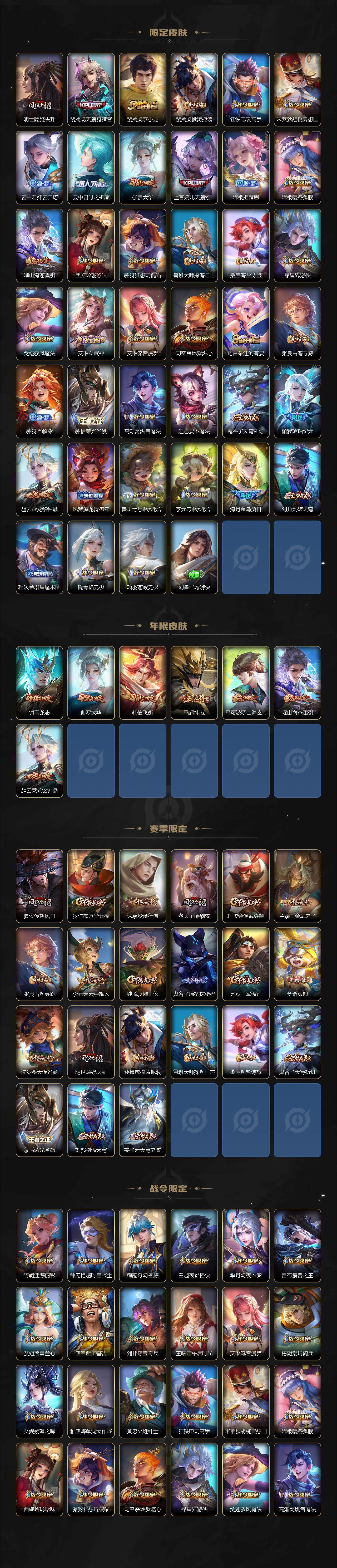 【限定皮肤】:姜子牙天穹之誓,狄仁杰阴阳师,赵云皇家上将,嬴政优雅恋人,阿轲迷踪丽影,钟无艳超时空战士,扁鹊奇幻香踪,白起夜都怪侠,芈月幻夜卜梦,吕布猎兽之王,夏侯惇朔风刀,甄姬落雪兰心,典韦蓝屏警告,马可波罗山海玄木吟,狄仁杰魔术师,狄仁杰万华元夜,达摩沙漠行僧,项羽海滩派对,老夫子醍醐杖,程咬金演武夺筹,露娜一生所爱,露娜启示之音,刘邦夺宝奇兵,韩信飞衡,韩信傲雪梅枪,王昭君午后时光,兰陵王金庭之子,孙悟空至尊宝,孙悟空大圣娶亲,孙悟空零号赤焰,孙悟空孙行者,李元芳云中旅人,虞姬启明星使,钟馗驱傩正仪,杨戬潮玩骑兵,女娲朔望之晖,干将莫邪胡桃夹子,雅典娜单词大作战,蔡文姬繁星吟游,鬼谷子原初探秘者,鬼谷子五谷丰年,诸葛亮武陵仙君,黄忠火炮绅士,铠青龙志,苏烈千军破阵,弈星混沌棋,梦奇顽趣,沈梦溪大漠名商,明世隐疑决卦,裴擒虎天狼狩猎者,裴擒虎李小龙,裴擒虎擒涛扼浪,狂铁电玩高手,米莱狄胡桃异想国,云中君纤云弄巧,云中君时之祈愿,伽罗太华,上官婉儿天狼绘梦者,嫦娥拒霜思,嫦娥暖冬兔眠,曜山海苍雷引,西施玲珑珍味,蒙犽狂想玩偶喵,鲁班大师探海日志,桑启海盐诗旅,暃星界游侠,戈娅驭风魔法,艾琳女武神,艾琳流音漫舞,司空震地狱燃心,阿古朵江河有灵,张良古海寻踪,蒙犽百解令,蒙恬荣光圣徽,高渐离燃音魔法,妲己灵卜魔法,鬼谷子天穹祈灯,伽罗琥珀纪元,赵云乘龙铭钟鼎,沈梦溪龙舞盛年,鲁班七号蔬乡物语,李元芳蔬乡物语,海月金乌负日,刘邦剑破天穹,程咬金群星魔术团,镜青焰无极,项羽苍威无极,刘备