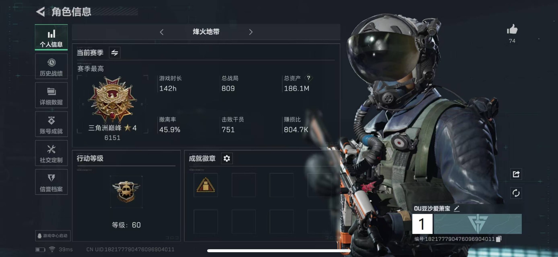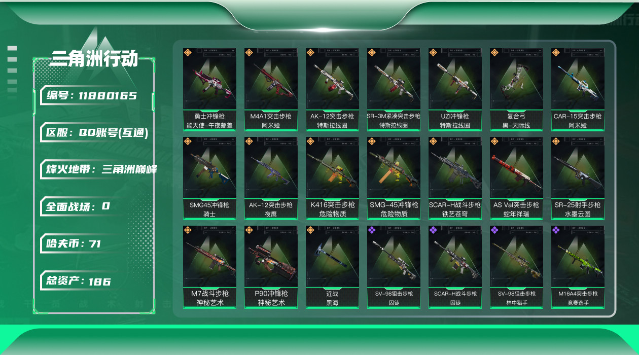 [11880165]总资产:186.1M 4干员外观 1近战传说 17传说枪械 哈夫币:71.442K 进阶安全箱(2×2)9.15号到期 可二次 可修改实名 优质装备:近战-黑海 烽火地带段位:三角洲巅峰 全面战场段位:军士长 传说武器皮肤:AS Val突击步枪-蛇年祥瑞,SR-25射手步枪-水墨云图,SCAR-H战斗步枪-铁艺苍穹,AK-12突击步枪-夜鹰,SMG45冲锋枪-骑士,M4A1突击步枪-阿米娅,CAR-15突击步枪-阿米娅,复合弓-黑-天际线,AK-12突击步枪-特斯拉线圈,SR-3M紧凑突击步枪-特斯拉线圈,UZI冲锋枪-特斯拉线圈,勇士冲锋枪-能天使-午夜邮差,P90冲锋枪-神秘艺术,M7战斗步枪-神秘艺术,SMG-45冲锋枪-危险物质,K416突击步枪-危险物质 史诗武器皮肤:SR-3M紧凑突击步枪-英雄,AUG突击步枪-蝮蛇,M700狙击步枪-蝮蛇,SR-25射手步枪-战场英杰,G3战斗步枪-战场英杰,Ash-12战斗步枪-守夜人,M16A4突击步枪-竞赛选手,PKM通用机枪-守夜人,AS Val突击步枪-尖端治疗,M700狙击步枪-守夜人,SG552突击步枪-尖端治疗,SR-25射手步枪-尖端治疗,MP5冲锋枪-深海恐惧,勇士冲锋枪-深海恐惧,AKM突击步枪-林中猎手,P90冲锋枪-暗影猎手,M1014霰弹枪-林中猎手,SV-98狙击步枪-林中猎手,PTR-32突击步枪-英雄,SV-98狙击步枪-囚徒,SCAR-H战斗步枪-囚徒,QBZ95-1突击步枪-曙光,沙漠之鹰-曙光,K416突击步枪-竞技风,Vector冲锋枪-阿萨拉文明,SVD狙击步枪-阿萨拉工艺,S12K霰弹枪-曙光,AS Val突击步枪-刀锋,PKM通用机枪-英雄,M700狙击步枪-竞技风,93R-博士,AUG突击步枪-战术迷彩 干员外观:蜂医-危险物质,威龙-壮志凌云,无名-夜鹰,露娜-黑·天际线