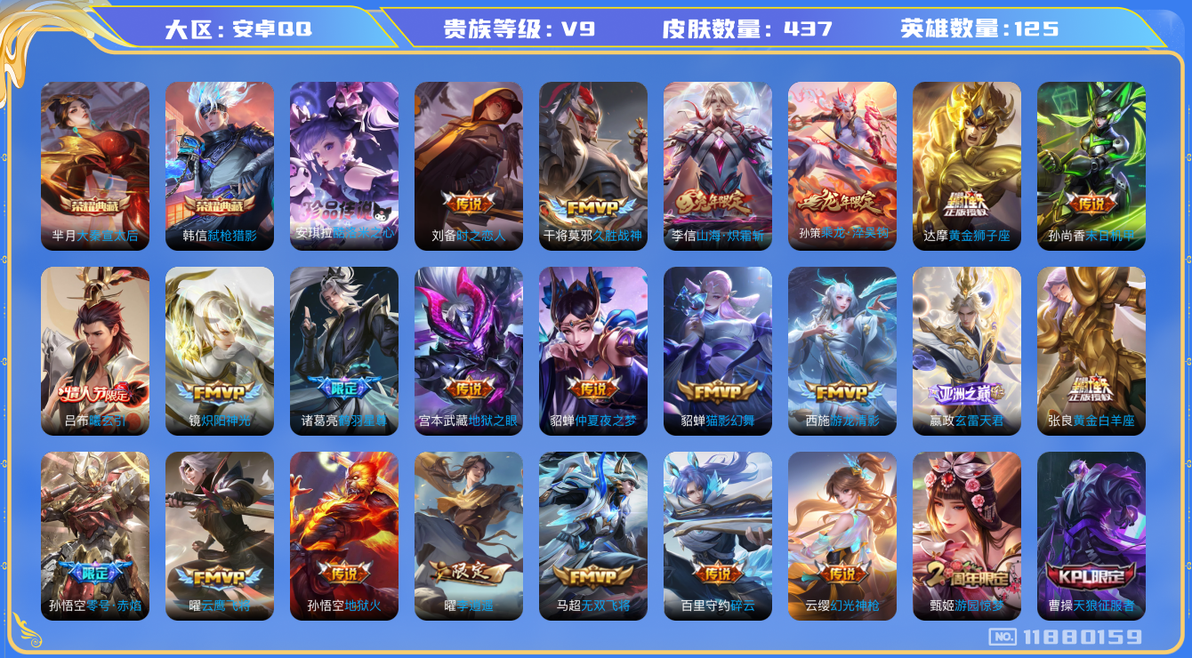 [11880159]V9 2典藏 1珍品传说 34传说 125英雄 437皮肤 可修改实名 优质装备:大秦宣太后,弑枪猎影(韩信典藏),酷洛米之心,黄金狮子座,云鹰飞将(小将军),黄金白羊座,猫影幻舞,久胜战神,炽阳神光,末日机甲-孙尚香(绿蚂蚱),地狱火,仲夏夜之梦(大飞蛾),零号·赤焰,地狱之眼,李逍遥,时之恋人-刘备(电焊工),游龙清影(小青龙),无双飞将,碎云,山海·炽霜斩(李信年限),鹤羽星尊,玄雷天君,涂山容容 传说皮:乘龙·淬吴钩(孙策年限),吕布曦玄引,幻光神枪 珍宝阁皮:优雅恋人,蔷薇恋人,女武神,玩趣恶龙 限定皮:愿照·岁时盈(虞姬年限),愿照·千秋盛(女娲年限),鸣野蒿,至尊宝,白虎志(电光耗子),凤求凰(白切鸡),凤凰于飞,武陵仙君(小桃花),傲雪梅枪,时之彼端,魔法小厨娘,白晶晶,时雨天司(水龙头),神威(电光马子),飞衡(韩信年限),遇见飞天,高山流水,诗剑行,五谷丰年,冰锋战神,天狼运算者,游园惊梦,梁祝,天狼狩猎者,天狼溯光者,天狼征服者,天狼绘梦者,李小龙,逐梦之影,辉光之辰,默契交锋-花木兰,孙行者,一生所爱,大圣娶亲,引擎之心,青春决赛季,冰霜恋舞曲,乒乒小将,匿光追影者,时之祈愿-瑶(瑶传限),玉兔公主,启示之音,枫霜尽,山海·玄木吟(马可年限) 史诗皮:鸭鸭历险记-刘禅,器灵·浮梦炉,糖绘人间,化蝶舞,星界战将,谪仙醉月,龙之律动,石田雨龙,茶境仙,怒海争锋,破空之剑,涂山红红,埋骨钱,琥珀纪元伽罗,蔬乡物语(鲁班七号),乘龙·忆丹青(大乔年限),百相守梦-黄忠,遇见神鹿,紫霞仙子,苍穹之光,电玩小子(小书包),白龙吟,黄金分割率,特工魅影,千年之狐,永昼,江河有灵,雪夜绮愿(周瑜),魅语,百解令(蒙犽),高渐离燃音魔法,蒙恬荣光圣徽,无限星赏官,匿光破解者,冰冠公主,青蛇,偶像歌手,晚萤,暗夜猫娘,龙骑士(小龙虾),末日机甲-吕布,猫狗日记-孙策,猫狗日记-大乔,乱世虎臣,节奏热浪,修罗,女仆咖啡,摇滚巨星,水果甜心,绅士熊喵,天才门将,星夜王子,心灵骇客,时之奇旅-安琪拉,功夫厨神,德古拉伯爵,暗隐猎兽者,幽灵船长,鬼剑武藏,心灵战警,乐园奇幻夜,天秀·启明,舞动绿茵,地狱岩魂,诗语江南,纤云弄巧,繁星吟游(呼啦呼啦),拒霜思,缤纷独角兽,乘风破浪,逐浪之夏,龙鼓争鸣,月团寄思,水晶猎龙者,曙光守护者,箭羽风息,金属风暴,原初追逐者,圣