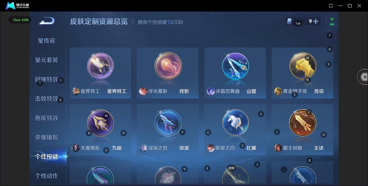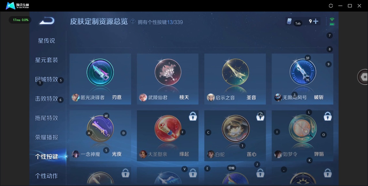 夏侯惇匿光决锋者,铠青龙志,赵云百木心枪,干将莫邪冰霜恋舞曲,项羽霸王别姬,吕布御风骁将,露娜启示之音,裴擒虎李小龙,裴擒虎天狼狩猎者,上官婉儿梁祝,马可波罗深海之息,女娲补天,虞姬霸王别姬,关羽冰锋战神