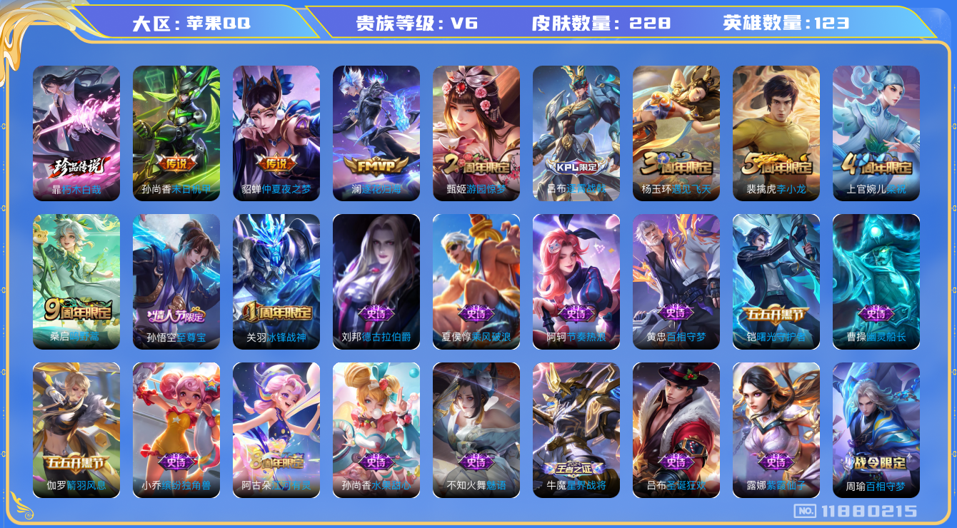 [11880215]V6 1珍品传说 4传说 123英雄 228皮肤 可修改实名 优质装备:朽木白哉,末日机甲-孙尚香(绿蚂蚱),仲夏夜之梦(大飞蛾),澜逐花归海,涂山容容 珍宝阁皮:妄想食味 限定皮:逐霄战戟,鸣野蒿,至尊宝,遇见飞天,冰锋战神,游园惊梦,梁祝,李小龙 史诗皮:鸭鸭历险记-刘禅,灵蛊蚀心,星界战将,谪仙醉月,百相守梦-周瑜,破空之剑,百相守梦-百里守约,百相守梦-黄忠,紫霞仙子,白龙吟,黄金分割率,特工魅影,千年之狐,江河有灵,魅语,百解令(蒙犽),冰冠公主,龙骑士(小龙虾),节奏热浪,修罗,女仆咖啡,水果甜心,天才门将,星夜王子,心灵骇客,功夫厨神,德古拉伯爵,暗隐猎兽者,幽灵船长,鬼剑武藏,心灵战警,天秀·启明,舞动绿茵,纤云弄巧,拒霜思,缤纷独角兽,乘风破浪,逐浪之夏,水晶猎龙者,曙光守护者,热力回旋,箭羽风息,原初追逐者,圣诞狂欢,圣诞恋歌,鹰眼统帅,暗夜贵公子,魅力维加斯,黎明之约