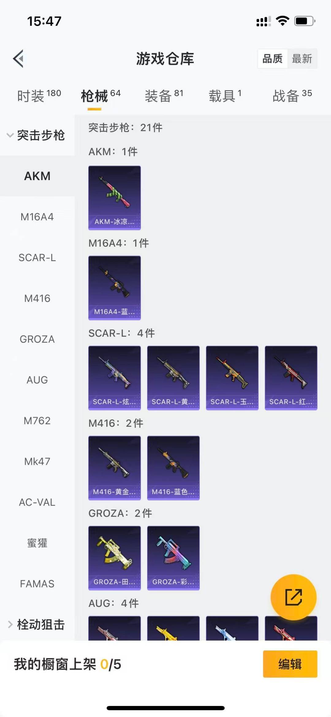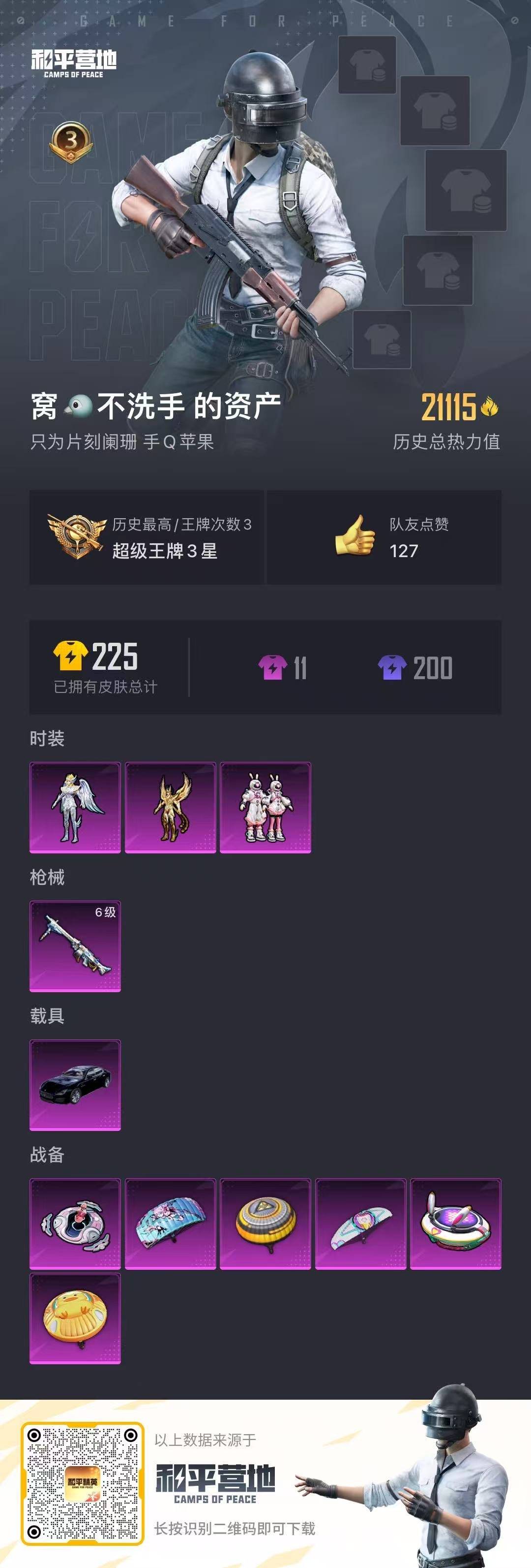 - PX_2104184-?/装备32/战备44/王牌印记1/热力值16847/AKM-彩虹符号/AKM-破晓战魂/AKM-萌趣颜团子/AKM-虎虎生威/AKM-霓虹街区/AKM-龙的传人/M16A4-幻世战舞者/SCAR-L-玉兔迎春/SCAR-L-红色方程式/M416-夜灯/M416-糯团青竹/M416-红色方程式/M416-蓝色火焰/GROZA-异彩先驱/GROZA-影袭/AUG-2P战斗服款/