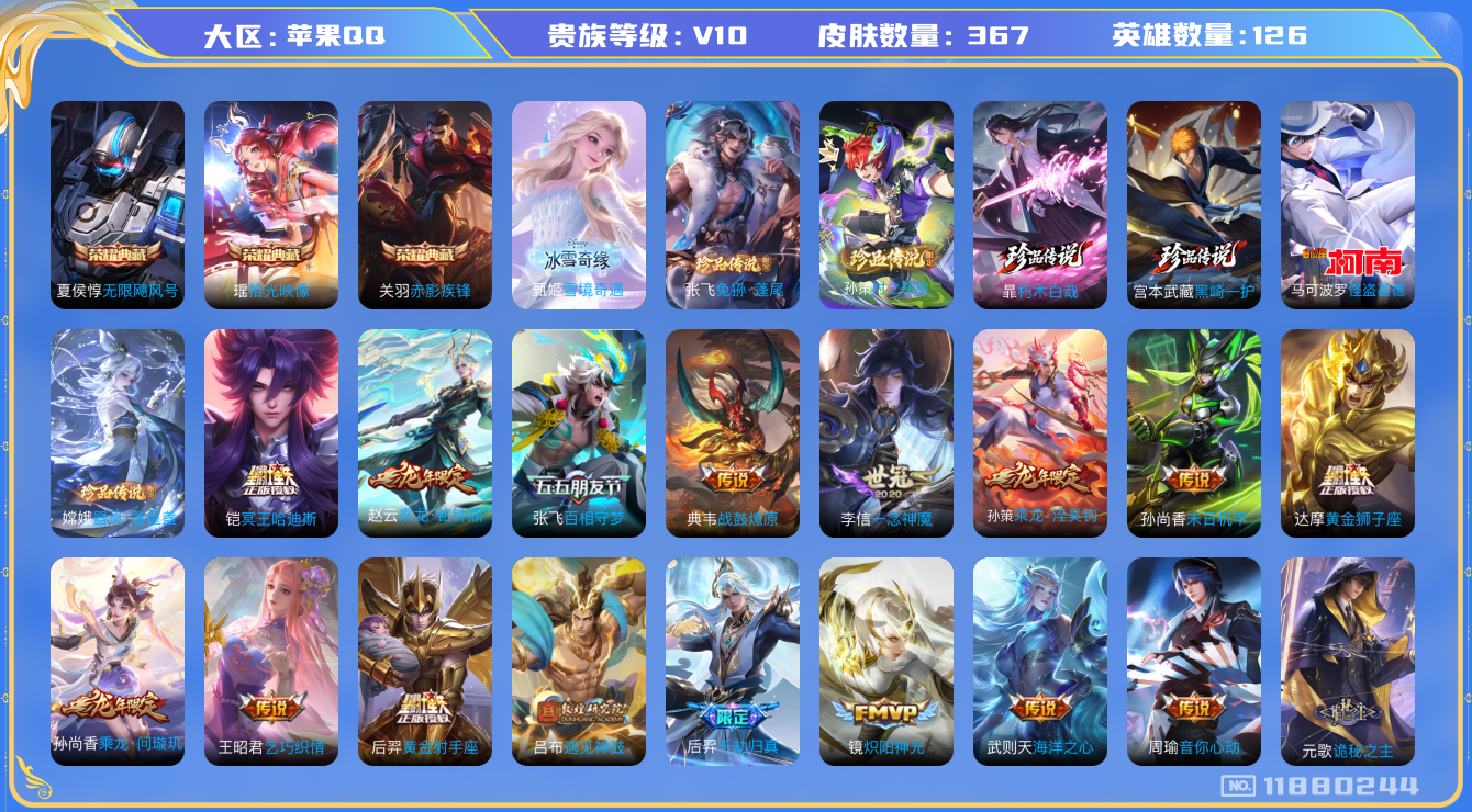 [11880244]V10 3典藏 1无双 6珍品传说 48传说 126英雄 367皮肤 典藏英雄武则天 可修改实名 优质装备:无限飓风号(高达),赤影疾锋,拾光映像(瑶典藏),雪境奇遇-甄姬,怪盗基德,器灵·落星盏,朽木白哉,黑崎一护,黄金狮子座,黄金射手座,黄金白羊座,炽阳神光,一念神魔,末日机甲-孙尚香(绿蚂蚱),地狱火,海洋之心,地狱之眼,音你心动-周瑜,胖达荣荣,乞巧织情,游龙清影(小青龙),无双飞将,神器·狴犴令,浮生妄,记忆之芯(机甲兔),百相守梦(张飞),电玩·雷克斯,遇见神鼓,澜逐花归海,艾琳觅芳踪,黄金天蝎座,千劫归真,诡秘之主,涂山容容 珍品传说:时之奇旅-孙策,兔狲·蓬尾 传说皮:乘龙·问璇玑(孙尚香年限),乘龙·铭钟鼎(赵云年限),乘龙·淬吴钩(孙策年限),典韦战鼓燎原,落雪白狼,铠冥王哈迪斯,星之鸣奏,祥瑞亨通,幻光神枪 珍宝阁皮:妄想食味 限定皮:愿照·九州拓(澜年限),愿照·福禄聚(蔡文姬年限),愿照·岁时盈(虞姬年限),愿照·山河定(司空震年限),愿照·众生和(妲己年限),愿照·千秋盛(女娲年限),逐霄战戟,鸣野蒿,夏侯惇霜北刀,至尊宝,傲雪梅枪,绯月行,神威(电光马子),诗剑行,逐梦之翼,虎魄,李小龙,玄武志(苏烈年限),永曜之星,圣诞老人,猪悟能,天魔缭乱,女儿国国王,寅虎·御盾(廉颇年限),寅虎·心曲(虎婆),寅虎·赤拳(老虎年限),唐三藏,匿光启智者,冰霜神祇 史诗皮:鸭鸭历险记-刘禅,飞车小橘子,苍鳞隐世,器灵·浮梦炉,糖绘人间,化蝶舞,星界战将,龙之律动,藏狐·褐绒,布丁狗之誓,石田雨龙,百相守梦-周瑜,茶境仙,怒海争锋,撼地雄心,破空之剑,战舞者,涂山红红,东方月初,蒙犽顽岩魄,埋骨钱,芈月浮光幕影,海诺心动手记,琥珀纪元伽罗,蔬乡物语(鲁班七号),乘龙·聚宝船(安琪拉年限),乘龙·忆丹青(大乔年限),百相守梦-百里守约,星界特工,百相守梦-黄忠,织梦人,紫霞仙子,苍穹之光,电玩小子(小书包),黄金分割率,特工魅影,千年之狐,永昼,江河有灵,鹤归松栖(赵怀真),浮梦罗烟,魅语,百解令(蒙犽),高渐离燃音魔法,蒙恬荣光圣徽,冰冠公主,青蛇,偶像歌手,晚萤,百相守梦(刘备),百相守梦(关羽),末日机甲-吕布,猫狗日记-孙策,时之恋人-孙尚香,乱世虎臣,节奏热浪,修罗,摇滚巨星,水果甜心,绅士熊喵,天才门将,星夜王子,心灵骇客,功夫厨神,德