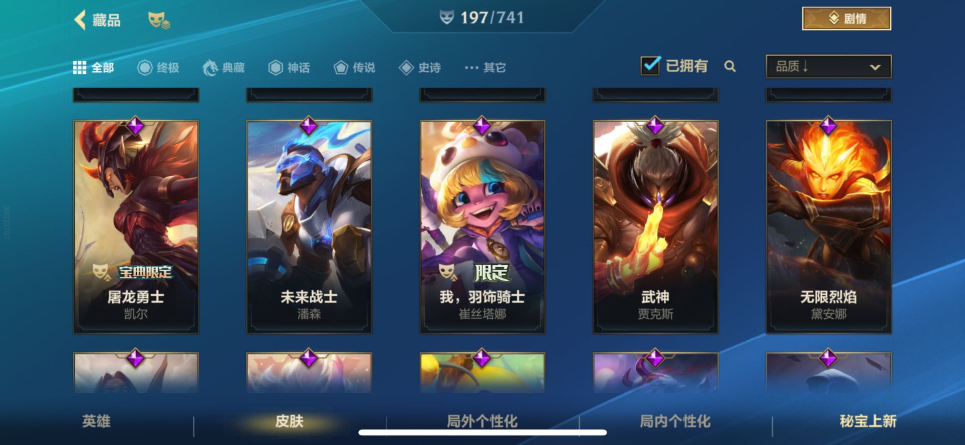 - [11678090]V8 1典藏 14传说 122英雄 228皮肤 可修改实名 优质装备:鸣剑·曳影,云鹰飞将(小将军),猫影幻舞,久胜战神,云霓雀翎,地狱火,仲夏夜之梦(大飞蛾),零号·赤焰,游龙清影(小青龙) 珍宝阁皮:女武神 限定皮:至尊宝,白虎志(电光耗子),梅西,异界灵契(白毛香),白鹤梁神女,时雨天司(水龙头),飞衡(韩信年限),高山流水,五谷丰年,游园惊梦,梁祝,御风骁将(吕布年限),天狼狩猎者,龙胆,逐梦之翼,逐梦之星,天狼溯光者,祈雪灵祝(雪兔子),李小龙,逐梦之影,逐梦之光,霸王别姬-项羽,霸王别姬-虞姬,默契交锋-花木兰,大圣娶亲,青春决赛季,蜜橘之夏,寅虎·御盾(廉颇年限),寅虎·赤拳(老虎年限) 史诗皮:紫霞仙子,白龙吟,千年之狐,偶像歌手,魅语,冰冠公主,猫狗日记-孙策,时之恋人-孙尚香,乱世虎臣,节奏热浪,女仆咖啡,摇滚巨星,水果甜心,天才门将,星夜王子,功夫厨神,德古拉伯爵,暗隐猎兽者,幽灵船长,鬼剑武藏,繁星吟游(呼啦呼啦),拒霜思,缤纷独角兽,乘风破浪,逐浪之夏,水晶猎龙者,曙光守护者,箭羽风息,金属风暴,圣诞恋歌,鹰眼统帅,魅力维加斯,寅虎·御盾