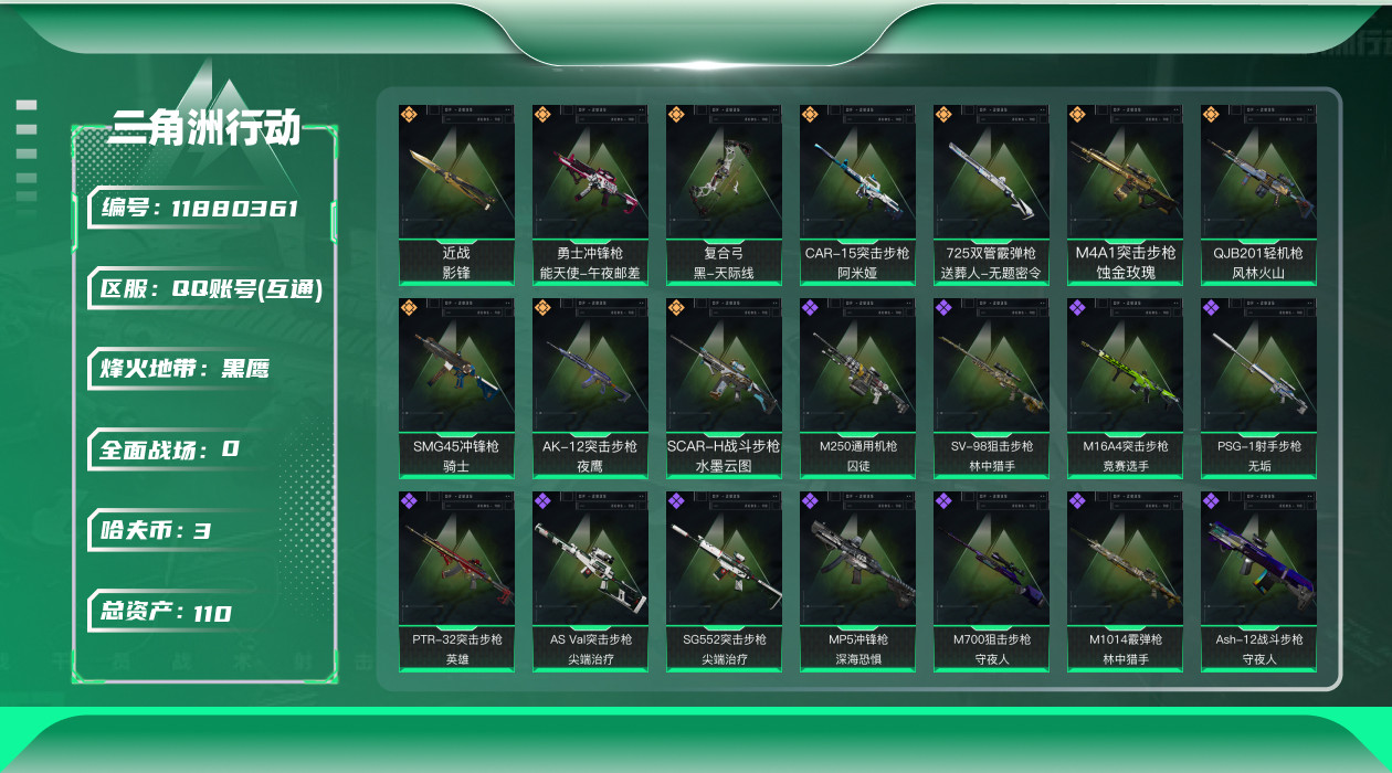 [11880361]总资产:110.9M 3干员外观 1近战传说 10传说枪械 哈夫币:3.072K 可二次 可修改实名 优质装备:近战-影锋,顶级安全箱(3x3) 烽火地带段位:黑鹰 全面战场段位:校官 传说武器皮肤:QJB201轻机枪-风林火山,SCAR-H战斗步枪-水墨云图,AK-12突击步枪-夜鹰,SMG45冲锋枪-骑士,CAR-15突击步枪-阿米娅,复合弓-黑-天际线,勇士冲锋枪-能天使-午夜邮差,725双管霰弹枪-送葬人-无题密令,M4A1突击步枪-蚀金玫瑰 史诗武器皮肤:QBZ95-1突击步枪-ACE,AUG突击步枪-特勤执行,Vector冲锋枪-红色彗星,PTR-32战斗步枪-ACE,SKS射手步枪-ACE,AUG突击步枪-蝮蛇,M700狙击步枪-蝮蛇,Ash-12战斗步枪-守夜人,SVD狙击步枪-暗夜猎手,M16A4突击步枪-竞赛选手,AS Val突击步枪-尖端治疗,M700狙击步枪-守夜人,SG552突击步枪-尖端治疗,MP5冲锋枪-深海恐惧,AKM突击步枪-林中猎手,M1014霰弹枪-林中猎手,SV-98狙击步枪-林中猎手,PTR-32突击步枪-英雄,M250通用机枪-囚徒,腾龙突击步枪-无垢,MP7冲锋枪-无垢,PSG-1射手步枪-无垢,沙漠之鹰-曙光,Vector冲锋枪-阿萨拉文明,S12K霰弹枪-曙光,PKM通用机枪-英雄,M700狙击步枪-竞技风 干员外观:红狼-蚀金玫瑰,威龙-壮志凌云,露娜-黑·天际线