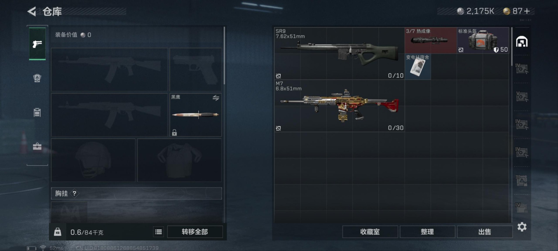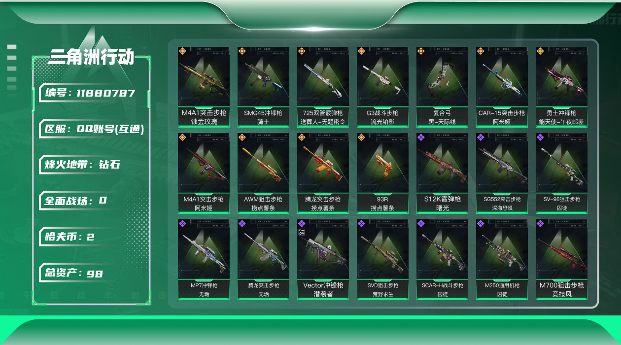 [11880787]总资产:98.8M 2干员外观 11传说枪械 哈夫币:2.175K 高级安全箱(2×3)9.15号到期 可二次 可修改实名 烽火地带段位:钻石 全面战场段位:军士长 传说武器皮肤:SMG45冲锋枪-骑士,G3战斗步枪-流光铂影,M4A1突击步枪-阿米娅,CAR-15突击步枪-阿米娅,复合弓-黑-天际线,AWM狙击步枪-捞点薯条,腾龙突击步枪-捞点薯条,93R-捞点薯条,勇士冲锋枪-能天使-午夜邮差,725双管霰弹枪-送葬人-无题密令,M4A1突击步枪-蚀金玫瑰 史诗武器皮肤:Vector冲锋枪-潜袭者,SG552突击步枪-深海恐惧,SVD狙击步枪-荒野求生,M250通用机枪-囚徒,SV-98狙击步枪-囚徒,SCAR-H战斗步枪-囚徒,腾龙突击步枪-无垢,MP7冲锋枪-无垢,S12K霰弹枪-曙光,M700狙击步枪-竞技风 干员外观:红狼-蚀金玫瑰,露娜-黑·天际线
