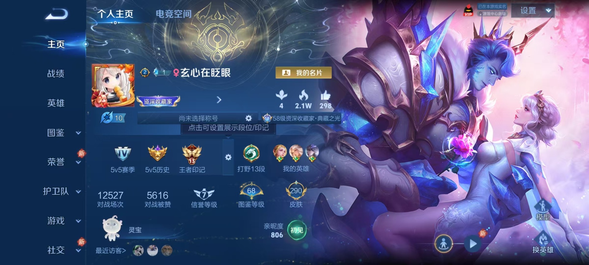 - PX_2109688-贵族等级: V5 英雄数: 79 皮肤数: 57 传说皮: 霜月吟,澜逐花归海,祥瑞亨通 限定皮: 鸣野蒿,逐霄战戟
