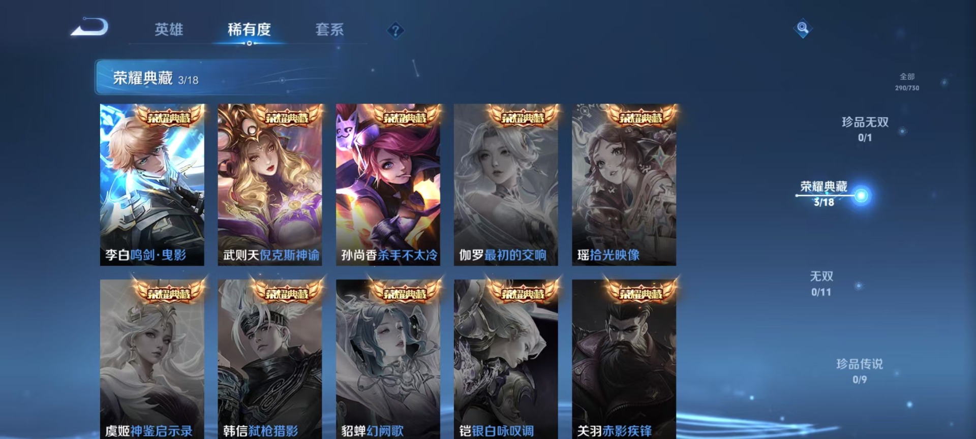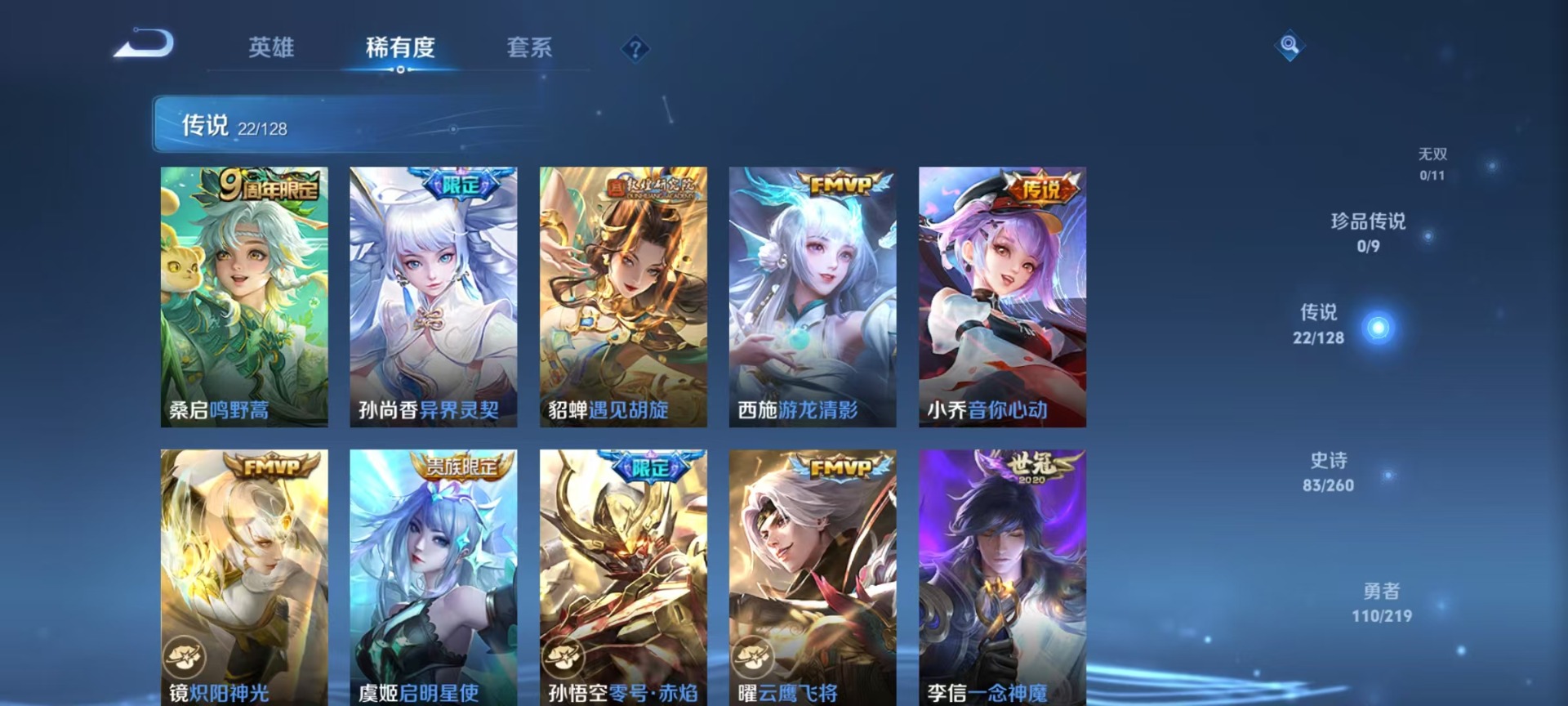 - PX_2095958-贵族等级: V8 英雄数: 124 皮肤数: 285 荣耀水晶: 天鹅之梦 星传说: 金色仲夏夜 传说皮: 云霓雀翎,末日机甲-孙尚香,仲夏夜之梦,音你心动-小乔,音你心动-周瑜,乞巧织情,超时空战士-狄仁杰,花朝如约,挚爱之约,挚爱花嫁,音你闪耀,山海·琳琅生,炽翼辉光 限定皮: 遇见飞天,游园惊梦,梁祝,白鹤梁神女,辉光之辰,白晶晶,天狼溯光者,天狼运算者,热情桑巴,纯白