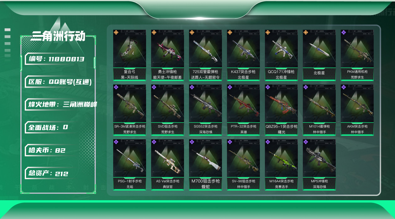 [11880813]总资产:212.9M 1近战传说 6传说枪械 哈夫币:82.912K 顶级安全箱(3×3)9.15号到期 可二次 可修改实名 优质装备:近战-北极星,顶级安全箱(3x3) 烽火地带段位:三角洲巅峰 全面战场段位:无段位 传说武器皮肤:复合弓-黑-天际线,QCQ171冲锋枪-北极星,勇士冲锋枪-能天使-午夜邮差,725双管霰弹枪-送葬人-无题密令,K437突击步枪-北极星 史诗武器皮肤:M700狙击步枪-蝮蛇,PKM通用机枪-荒野求生,MP5冲锋枪-深海恐惧,SR-3M紧凑突击步枪-荒野求生,SG552突击步枪-深海恐惧,AKM突击步枪-林中猎手,M16A4突击步枪-竞赛选手,SVD狙击步枪-荒野求生,M1014霰弹枪-林中猎手,SV-98狙击步枪-林中猎手,PTR-32突击步枪-英雄,PSG-1射手步枪-无垢,AS Val突击步枪-典狱官,QBZ95-1突击步枪-曙光