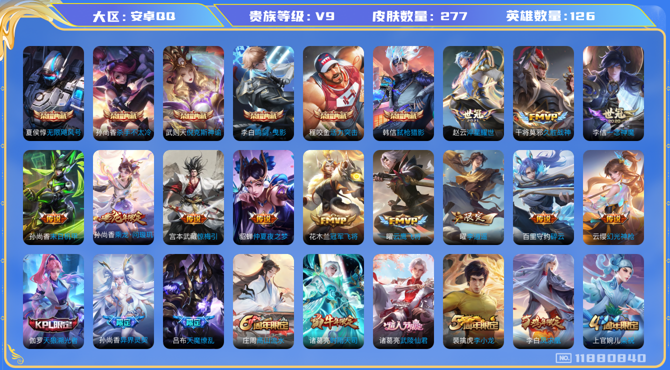 [11880840]V9 6典藏 21传说 126英雄 277皮肤 典藏英雄武则天 可修改实名 优质装备:倪克斯神谕(宇宙婆娘),无限飓风号(高达),活力突击,杀手不太冷,鸣剑·曳影,弑枪猎影(韩信典藏),冠军飞将,云鹰飞将(小将军),久胜战神,一念神魔,末日机甲-孙尚香(绿蚂蚱),仲夏夜之梦(大飞蛾),李逍遥,淬星耀世,碎云,惊梅引 传说皮:乘龙·问璇玑(孙尚香年限),幻光神枪 珍宝阁皮:妄想食味,蔷薇恋人 限定皮:鸣野蒿,至尊宝,凤求凰(白切鸡),凤凰于飞,武陵仙君(小桃花),异界灵契(白毛香),前尘镜,时雨天司(水龙头),高山流水,五谷丰年,武圣,梁祝,逐梦之星,天狼溯光者,李小龙,猪悟能,大圣娶亲,天魔缭乱,美猴王 史诗皮:星界战将,龙之律动,蔬乡物语(鲁班七号),百相守梦-百里守约,紫霞仙子,苍穹之光,电玩小子(小书包),白龙吟,黄金分割率,特工魅影,千年之狐,永昼,魅语,高渐离燃音魔法,冰冠公主,偶像歌手,暗夜猫娘,龙骑士(小龙虾),末日机甲-吕布,猫狗日记-孙策,猫狗日记-大乔,时之恋人-孙尚香,乱世虎臣,节奏热浪,修罗,女仆咖啡,摇滚巨星,水果甜心,绅士熊喵,天才门将,星夜王子,心灵骇客,功夫厨神,德古拉伯爵,暗隐猎兽者,幽灵船长,鬼剑武藏,心灵战警,天秀·启明,舞动绿茵,地狱岩魂,纤云弄巧,拒霜思,缤纷独角兽,乘风破浪,逐浪之夏,月团寄思,水晶猎龙者,曙光守护者,箭羽风息,金属风暴,原初追逐者,圣诞狂欢,圣诞恋歌,鹰眼统帅,暗夜贵公子,魅力维加斯,黎明之约,雪上飞焰,未来纪元-赵云
